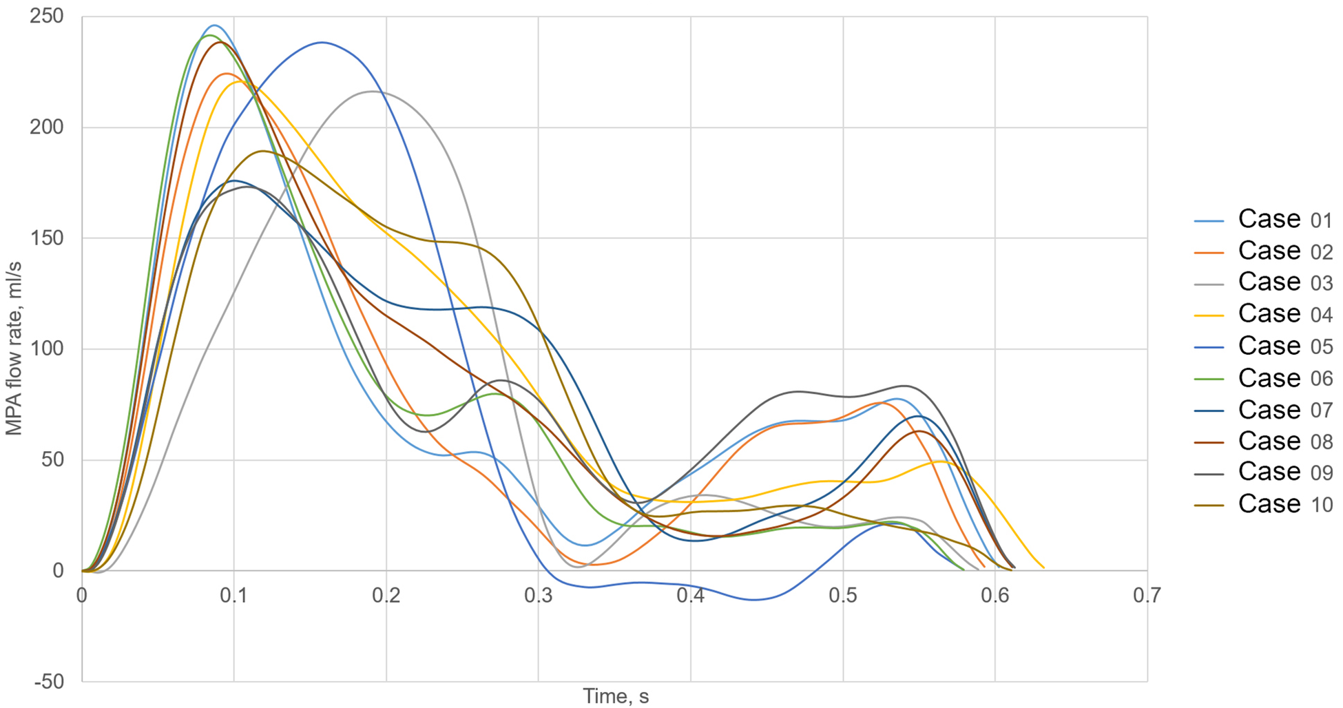 Volume flow waveforms used as the main pulmonary artery (MPA) inlet boundary condition for all 10 cases.