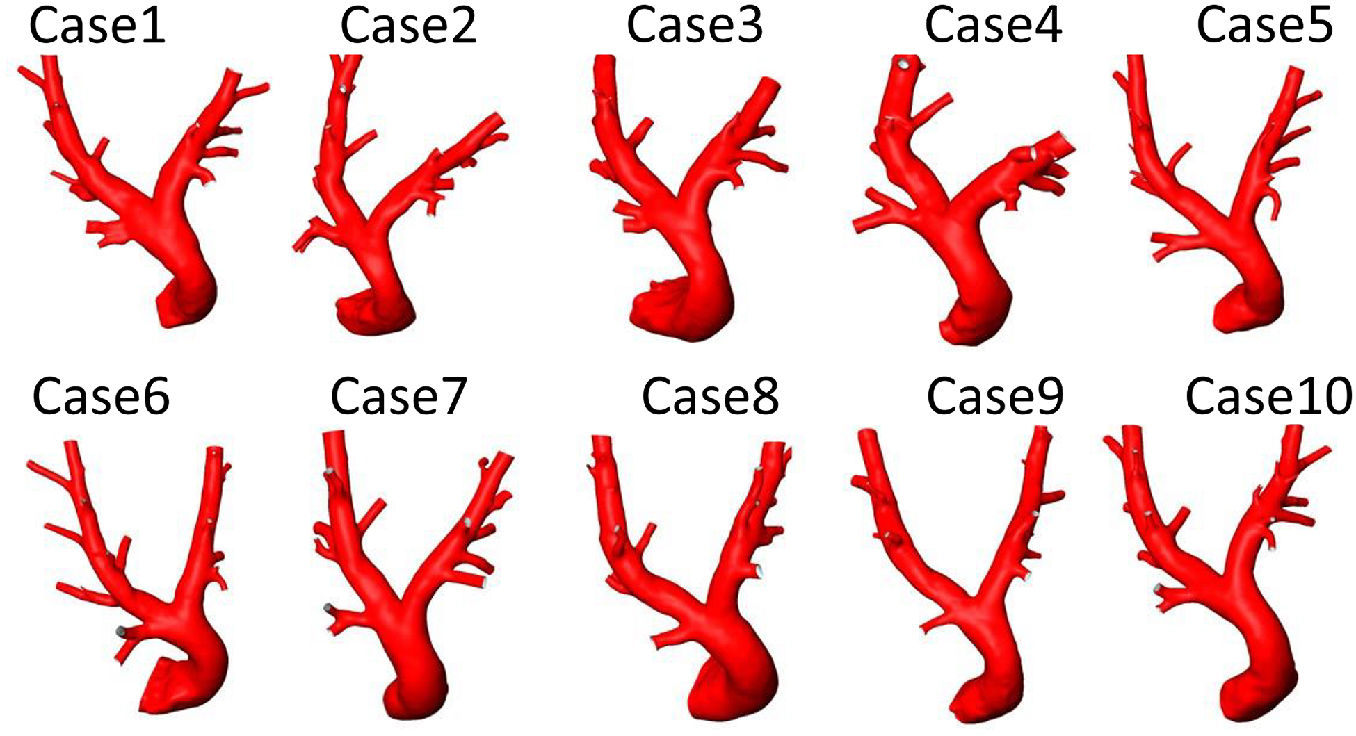 Geometries of 10 porcine pulmonary arteries reconstructed from computed tomography data acquired before the pulmonary artery pressure sensor implantation.