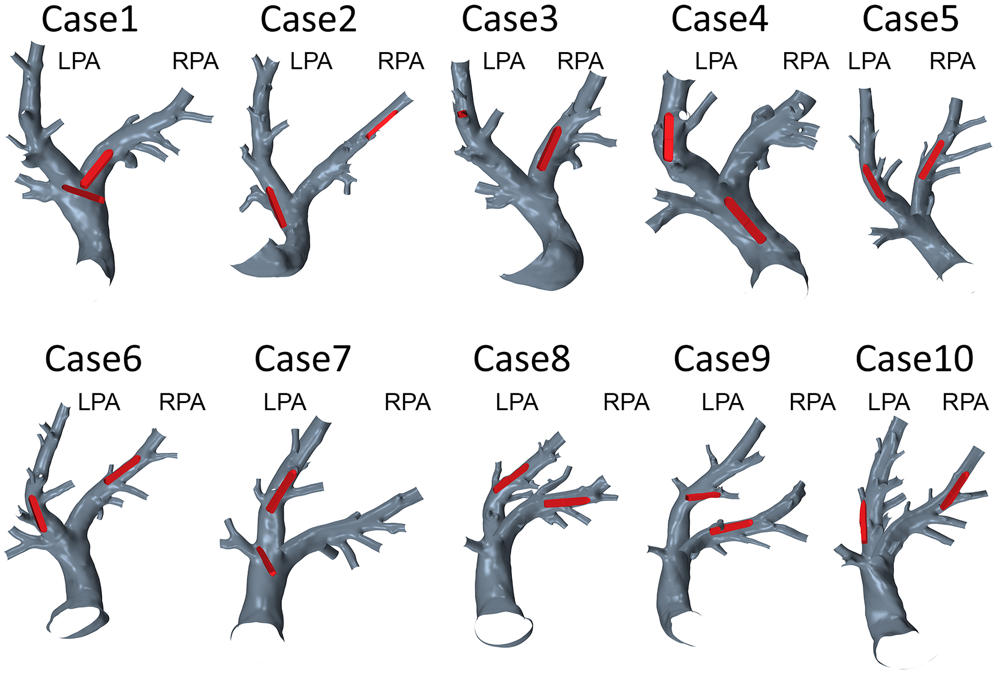Geometries of 10 pulmonary arteries together with the respective device positions in the left (LPA) or right (RPA) pulmonary artery.