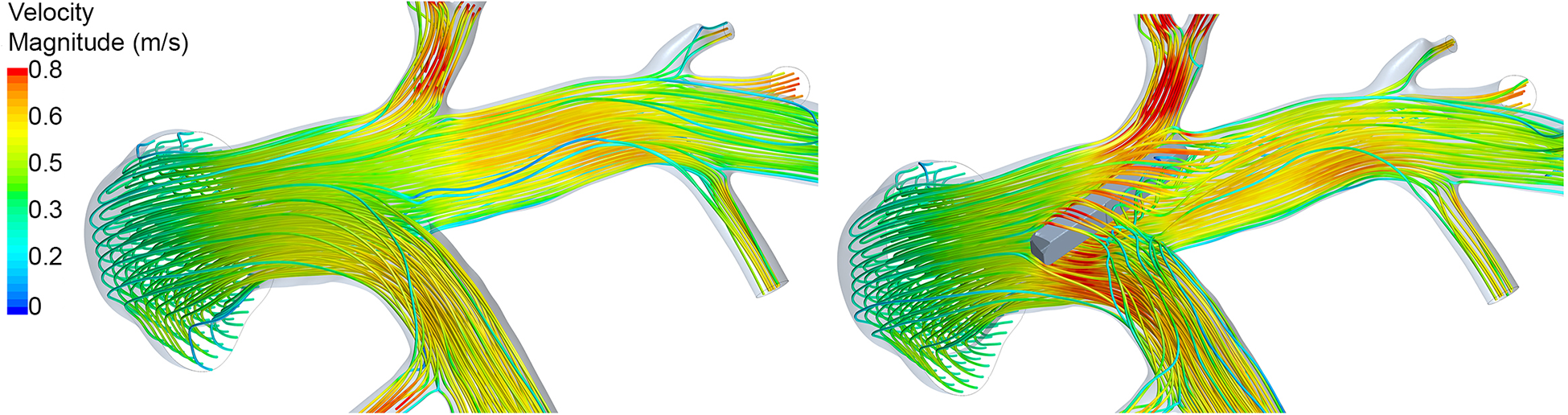 Illustration of the peak-systolic hemodynamics using streamlines in Case 07 before (left) and after (right) virtual device implantation. Streamlines are color-coded using the velocity magnitude. After device implantation, marked perturbation of the flow is observed due to the non-optimal device position.