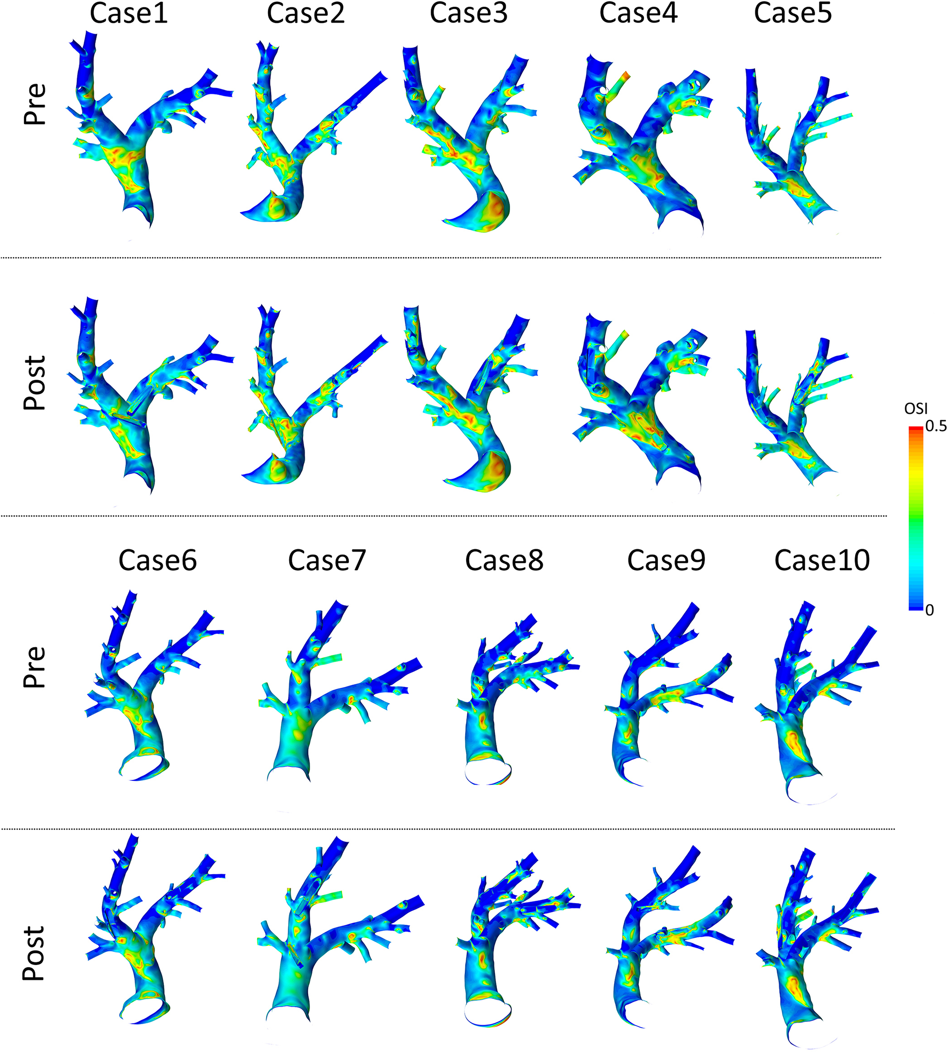 Spatial distributions of oscillatory shear index (OSI) values before (pre) and after (post) virtual device implantation.
