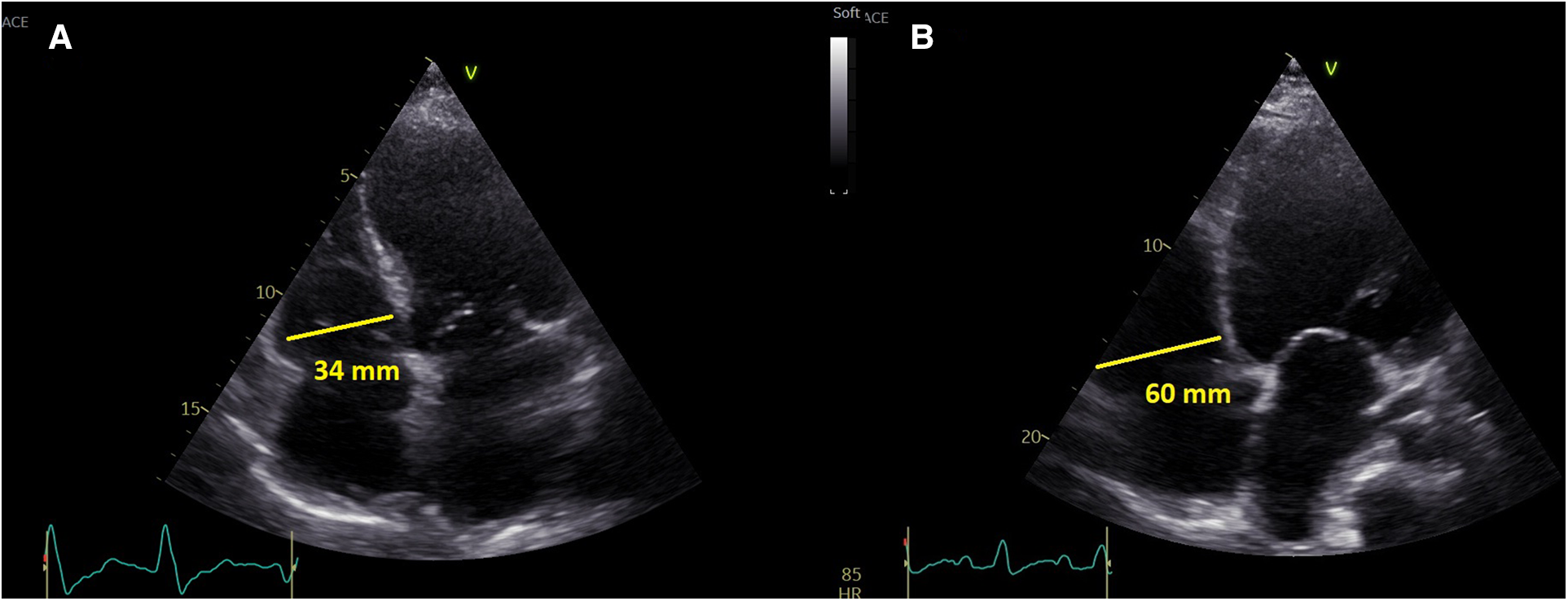 A representative presentation of non-dilated right ventricle (left) and dilated right ventricle (right).