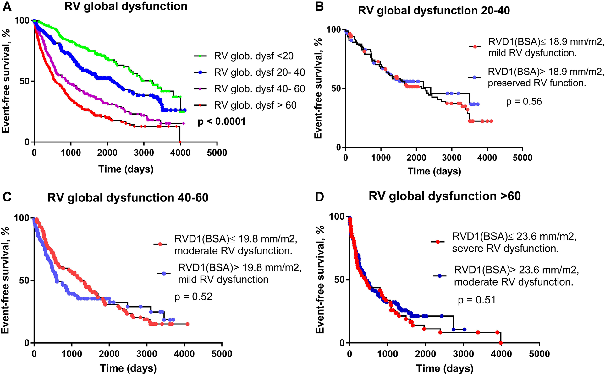 The relationship between RV global dysfunction score and prognosis. (A) Kaplan-Meier analysis of event-free survival according to RV global dysfunction score. (B) RV global dysfunction 20–40; RVD1i median = 18.9 mm/m2. RVD1i ≤ 18.9 mm/m2 and mild RV dysfunction (N = 84), RVD1i > 18.9 mm/m2 and preserved RV function (N = 67). (C) RV global dysfunction 40–60; RVD1i median = 19.8 mm/m2. RVD1i ≤ 19.8 mm/m2 and moderate RV dysfunction (N = 91), RVD1i > 19.8 mm/m2 and mild RV dysfunction (N = 88). D) RV global dysfunction >60; RVD1i median = 23.6 mm/m2. RVD1i ≤ 23.6 mm/m2 and severe RV dysfunction (N = 52), RVD RVD1i > 23.6 mm/m2 and moderate RV dysfunction (N = 99).