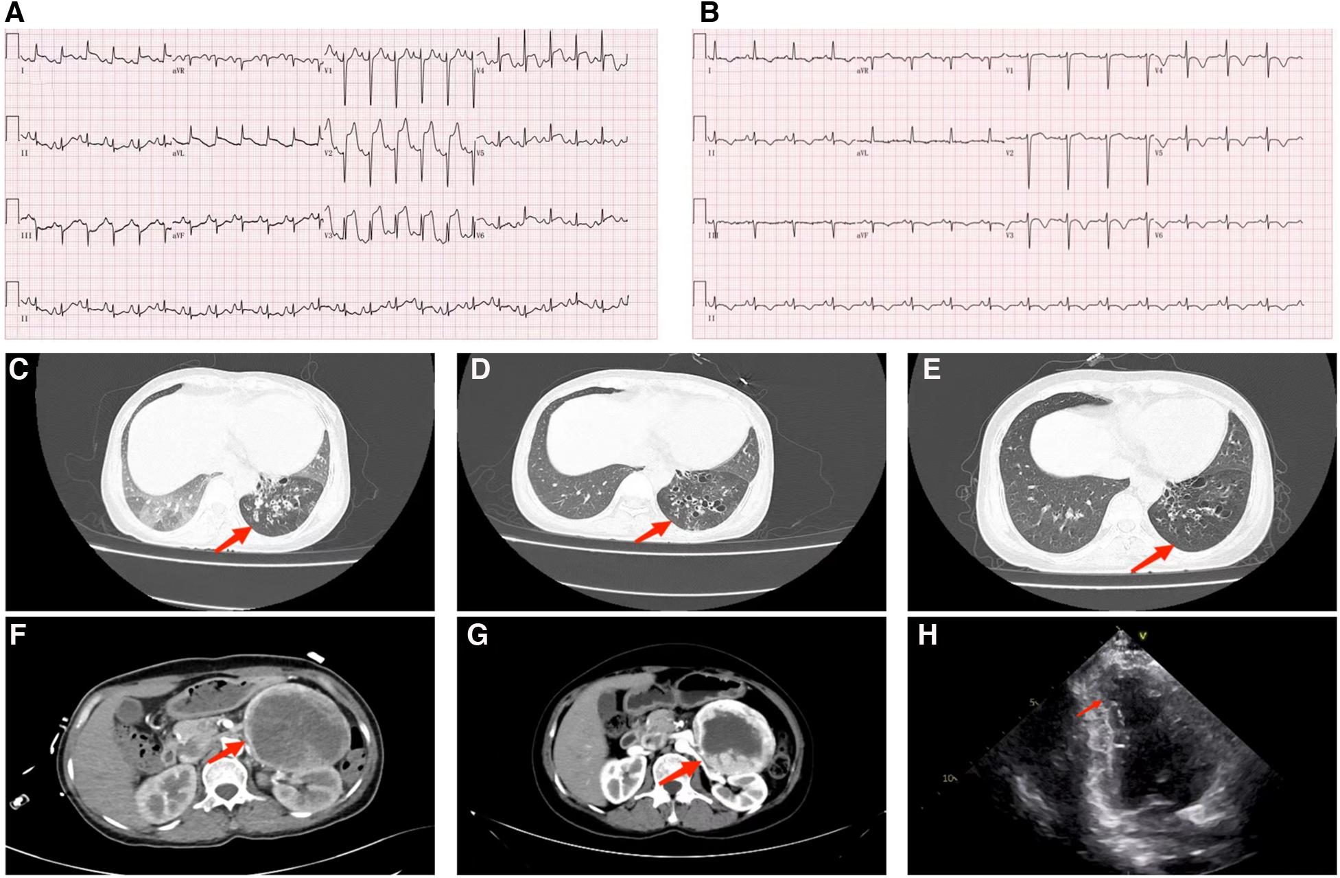 (A) ECG of the admitted patient; (B) ECG of patients after treatment with phenoxybenzamine. (C) Lung CT examination at admission shows that bronchiectasis of the lower lobe of the left lung is associated with infection, bilateral lung inflammation (red arrow). (D) Pulmonary CT on the second day after the addition of phenbenamine, displays Bronchiectasis of the lower lobe of the left lung with slight relief of infection (red arrow). (E) Preoperative lung CT re-examination depicts that the degree of bronchiectasis with infection in the lower lobe of the left lung is slightly less than that of the previous one (red arrow). (F) Abdominal enhanced CT manifests that mass high density mixed density shadow can be observed in the left middle and upper abdomen; the maximum level is about 7.7 cm × 9.4 cm (red arrow). (G) Preoperative abdominal CT review, appearing roughly similar to the previous image (red arrow). (H) Systolic period in the apical two chamber (A2C) view: displays the apical wall of left ventricle becomes thinner; outward bulg and reduction of amplitude of motion (red arrow).