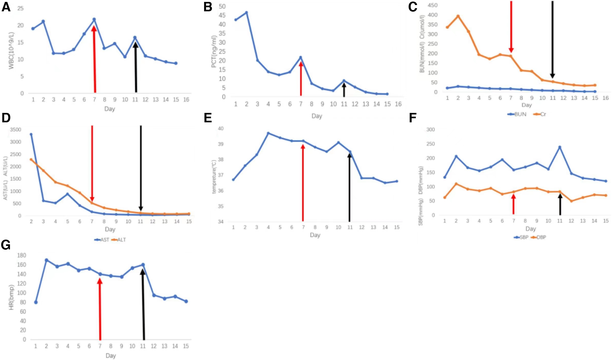 Phenoxybenzamine was used from the 7th day. The red arrow indicates the start of the treatment with phenoxybenzamine, and the black arrow indicates the increase of the dosage of phenoxybenzamine. (A) White blood cell count. (B) procalcitonin count. (C) Blood urea nitrogen and creatinine levels. (D) Liver function tests, aspartate transaminase, and alkaline phosphatase. (E) Daily maximum temperature. (F) Daily maximum systolic and diastolic blood pressure. (G) Heart rate.