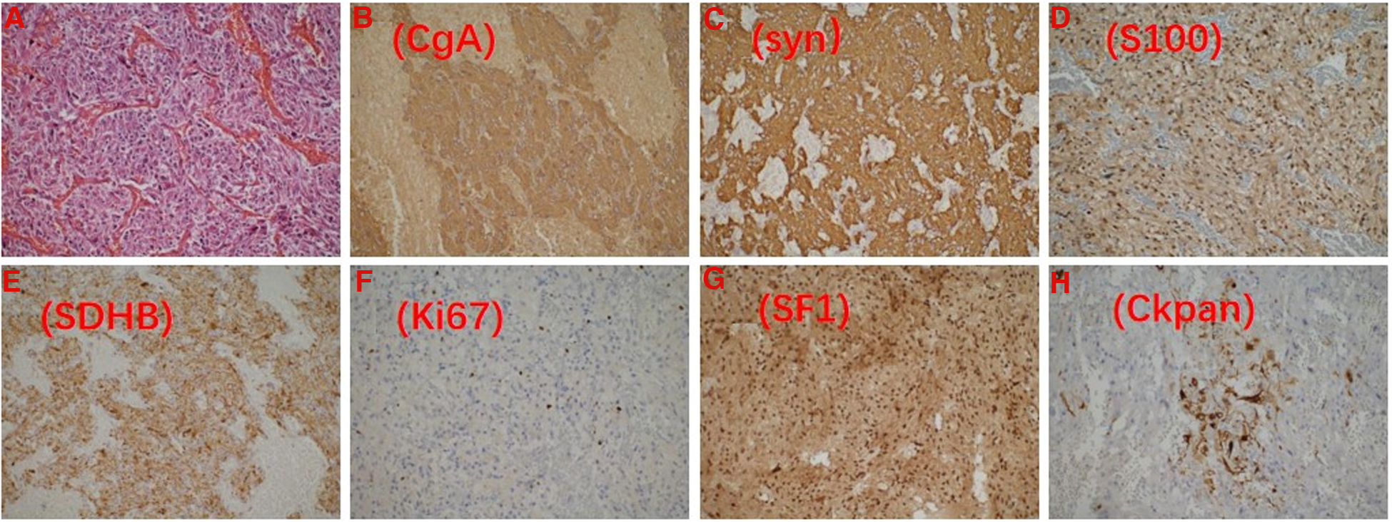 Pathological image. (A) HE staining of pheochromocytoma; the tumor is positive for chromogranin-A (B) and synaptophysin (C); S100 shows a well-developed sustentacular cell network (D); The nontumorous elements (e.g. endothelial cells, stromal cells, etc.); SDHB remains positive (E); Ki67 (+2%) (F). Pheochromocytoma is positive for SF-1 (G) and CK-pan (H).