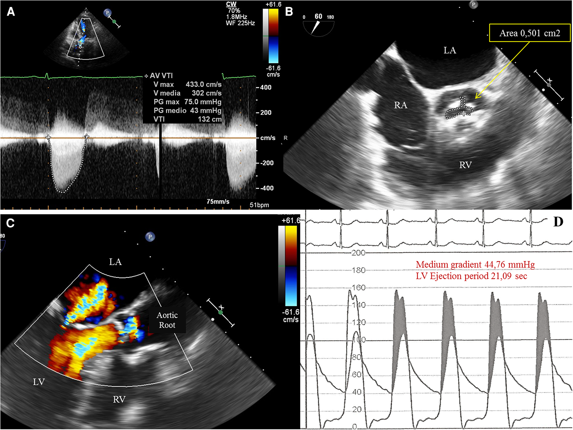 (A) Transthoracic echocardiography (TTE) 5-chamber view showing increased peak and medium transvalvular aortic pressure gradient of, respectively, 75 mmHg and 43 mmHg. (B)Transesophageal echocardiography (TEE) showing a tricuspid aortic valve with severe stenosis and a planimetric aortic valve area of 0,5 cm2. LA, left atrium; RA, right atrium; RV, right ventricle. (C) TEE showing a mild mitral valvular insufficiency with neither significant subvalvular and/or intraventricular pressure gradient nor evidence of systolic anterior motion (SAM) of the anterior leaflet of the mitral valve. (D) Invasive simultaneous registration of left ventricular (LV) and aortic pressures showing a significant transvalvular pressure gradient during the ventricular ejection period. LV pressure exceeds the aortic pressure (gray area, pressure gradient generated by valvular stenosis). The LV peak systolic pressure during ejection ranged between 152 to 156 mmHg and the aortic pressure between 102 to 106 mmHg. No elevated LV telediastolic pressure was documented.).