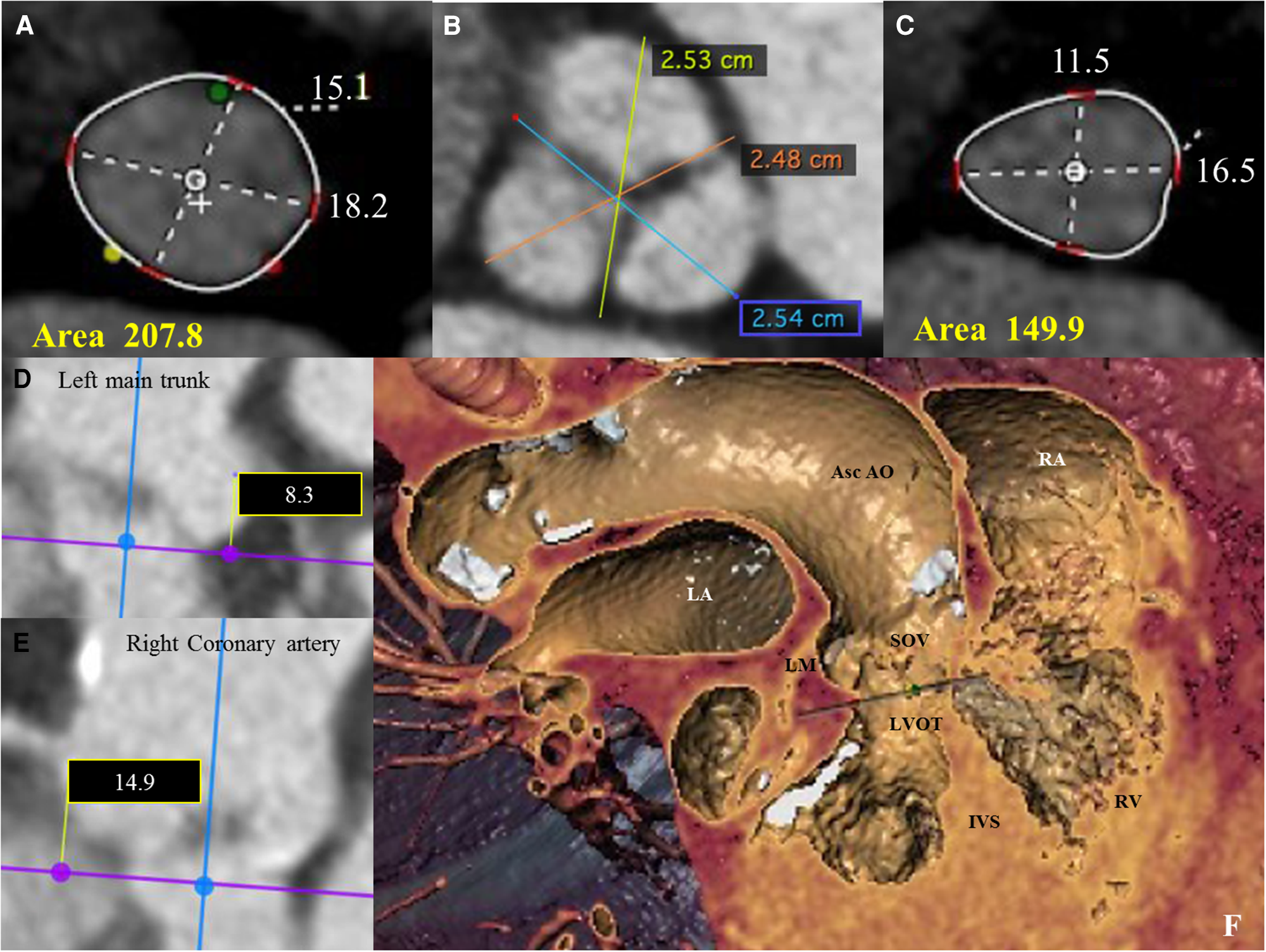 (A) Pre-operative thoraco-abdominal computed tomography (CT) images were analyzed using 3mensio Structural Heart software (Pie Medical Imaging, Netherlands): the aortic annulus perimeter was 51.7 mm (minor annulus diameter 15.1 mm, major annulus diameter 18.2 mm) and the area was 207,8 mm2. (B) Pre-operative thoraco-abdominal CT images showed a tricuspid aortic valve without significant valvular calcifications (images reconstructed with OsiriX DICOM Viewer Pixmeo SARL, Switzerland). (C) Pre-operative thoraco-abdominal CT images showed a LVOT perimeter of 45.3 mm with elliptical shape (minor annulus diameter 11.5 mm, major annulus diameter 16.5 mm) and an area of 149,9 mm2 (images reconstructed with 3mensio Structural Heart software). (D and E) CT images showing the distance from the virtual basal ring (VBR) to left main trunk of 8.3 mm (see D) and to the right coronary artery of 14.9 mm (see E). (F) Pre-operative thoraco-abdominal CT images showing the heart chambers and the ascending aorta according to the ‘double oblique virtual reality’ reconstruction with 3mensio Structural Heart software. Asc Ao, Ascending Aorta; IVS, interventricular septum; LM, left main coronary trunk; LA, left atrium; LVOT, left ventricular outflow tract; RA, right atrium; RV, right ventricle.