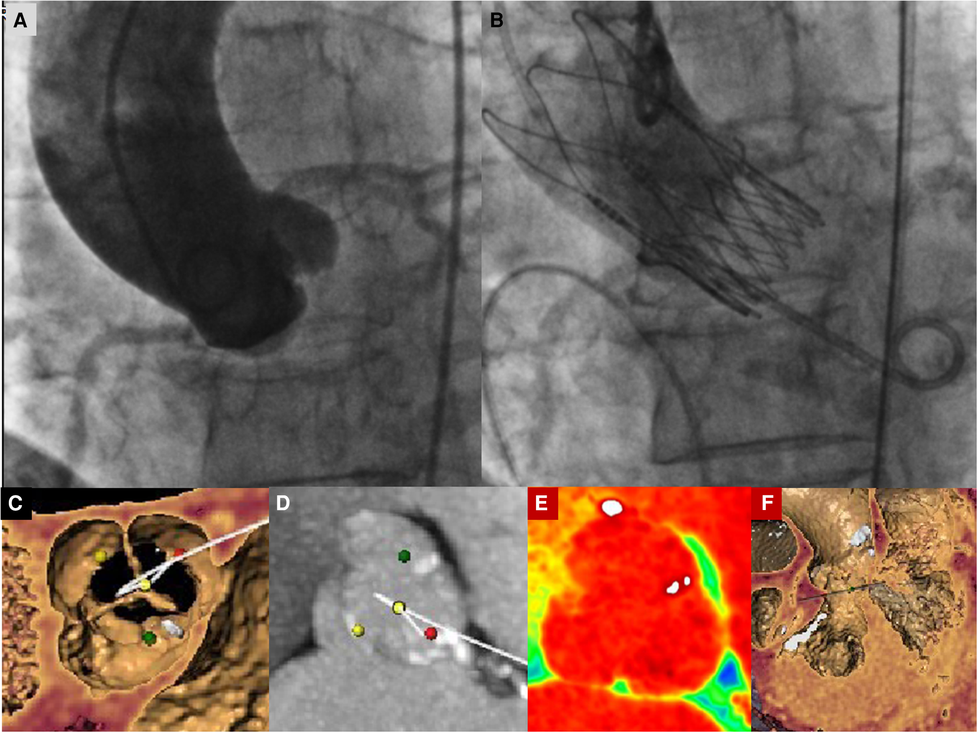 (A) Basal aortography in the “virtual basal plane” view (LAO 5°−10° cranial projection). (B) Final aortography documenting correct implantation of an Acurate Neo 2 small-size valve with patent coronary arteries and correct minimal LVOT protrusion of the THV to ensure anchoring without any trace of paravalvular leak. (C) Preprocedural images of CT angiography with tridimensional reconstruction of the aortic valve showing a tricuspid aortic valve. The yellow dot identifies the non-coronary cusp, the red dot identifies the left coronary cusp, and the green dot identifies the right coronary cusp. (D–F) Preprocedural images of CT angiography with tridimensional reconstruction of the aortic valve showing a tricuspid aortic valve without significant calcific degeneration and left and right ventricular chambers. In Panel (D), the yellow dot identifies the non-coronary cusp, the red dot identifies the left coronary cusp, and the green dot identifies the right coronary cusp.
