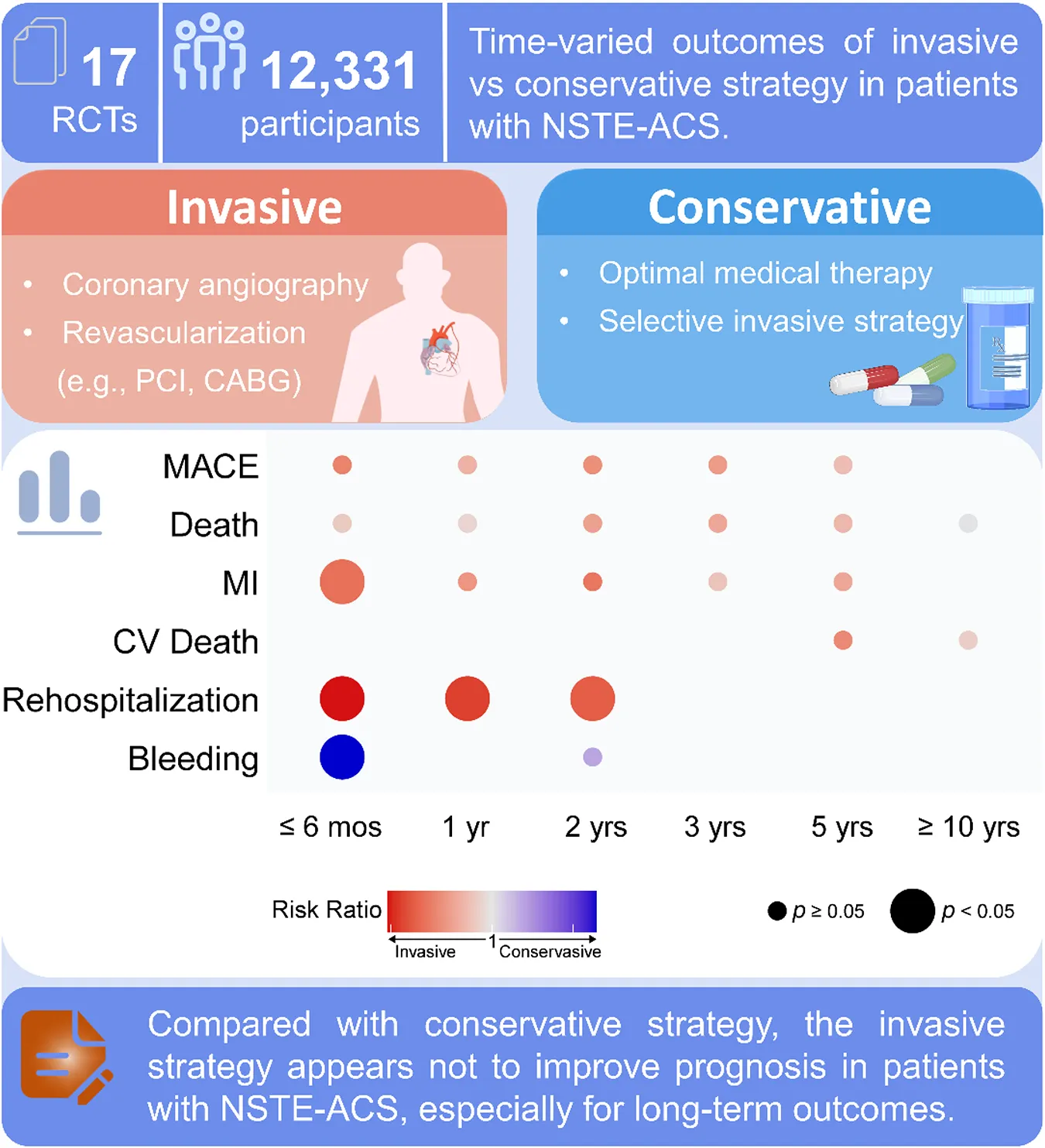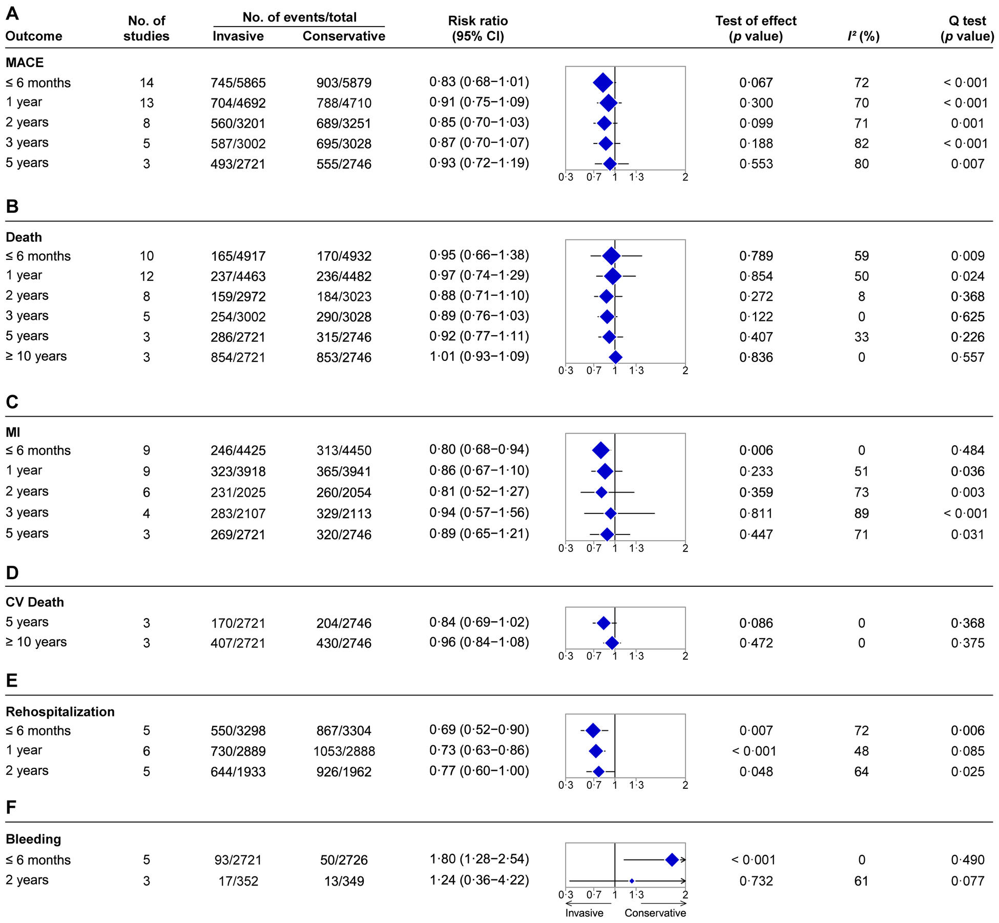 In this regard, we performed a comprehensive meta-analysis of the time-varied outcomes of the invasive and conservative strategies based on RCTs. We included 17 RCTs involving 12,331 participants. The follow-up time was categorized into six different periods, namely, ≤6 months, 1 year, 2 years, 3 years, 5 years, and ≥10 years. The time-varied outcomes included MACE, death, MI, rehospitalization, cardiovascular (CV) death, bleeding, in-hospital death, and in-hospital bleeding.