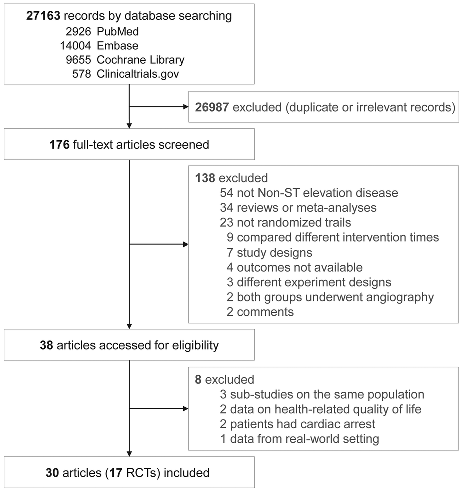 Our search retrieved 27,163 items, of which 26,987 duplicate or irrelevant records were excluded. After screening full texts, 38 articles remained and were then evaluated in detail. From these, three articles (43–45) belonging to sub-studies of three trials (11, 16, 29), two articles (46, 47) comparing health-related quality of life, two articles (48, 49) reporting patients with out-of-hospital cardiac arrest, and one article (50) analyzing real-world outcomes were excluded. Eventually, this meta-analysis included 30 articles from 17 RCTs involving 12,331 participants (Figure 1). Some articles reported data from different follow-up time points from the FRISC-II (14–19), ICTUS (25–28), RITA 3 (6–9), and TIMI IIIB (29, 30) trials.