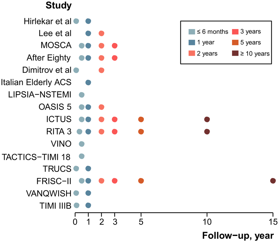 The Appendix in the Supplementary material details the main features of the 17 RCTs (Supplementary Table S2) and the outcome definitions (Supplementary Table S3). Table 1 summarizes the baseline characteristics of the participants. The mean or median age of the RCTs ranged from 56 to 85 years. The proportion of males was mostly between 49% and 73%. The diabetes rates typically ranged from 12% to 46%. The proportion of previous MI incidence was generally less than 50%. Approximately 9%–25% of patients had undergone percutaneous coronary intervention (PCI), and 4%–18% underwent coronary artery bypass graft (CABG). The follow-up time points of the 17 RCTs ranged from 1 month to 15 years (Figure 2).