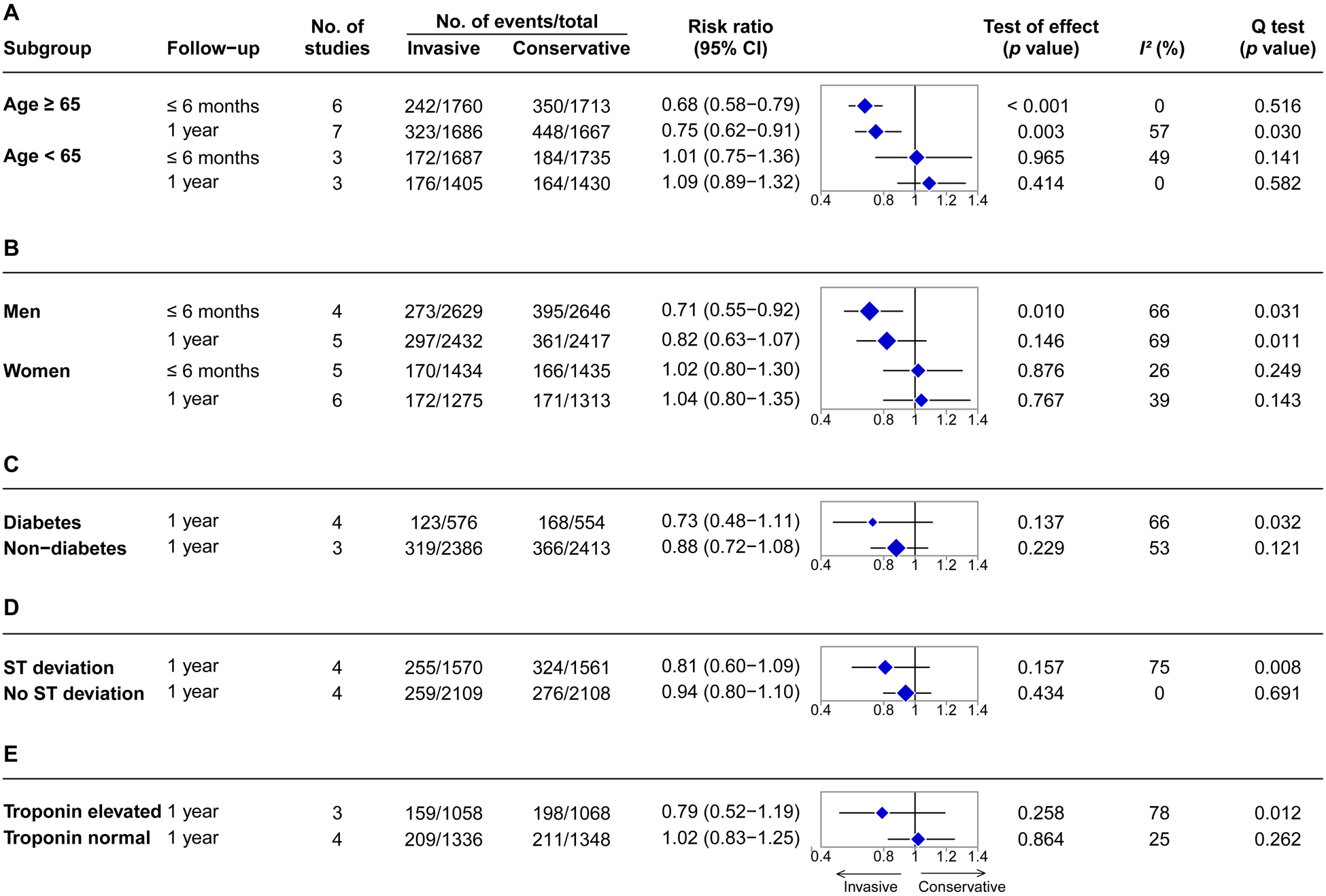 Summary effects of invasive versus conservative strategy on major adverse cardiovascular events for NSTE-ACS in subgroups stratified by high-risk features. (A) Stratified by age. (B) Stratified by gender. (C) Stratified by diabetes. (D) Stratified by ST-segment status. (E) Stratified by troponin level. The blue diamond represents the pooled risk ratio. The horizontal bar represents 95% confidence intervals. The size of the diamond is proportional to the total number of participants included in the analyses.