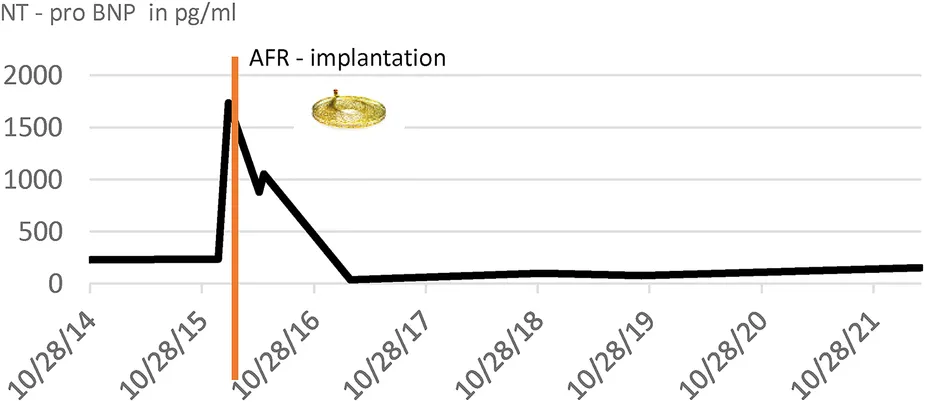 Elevated NTāāāpro BNP levels at the time of implantation, Red line: time of AFRāāāImplantation, normalization of NTāāāpro BNP levels after implantation, and maintaining levels within a normal range over a long-term period.
