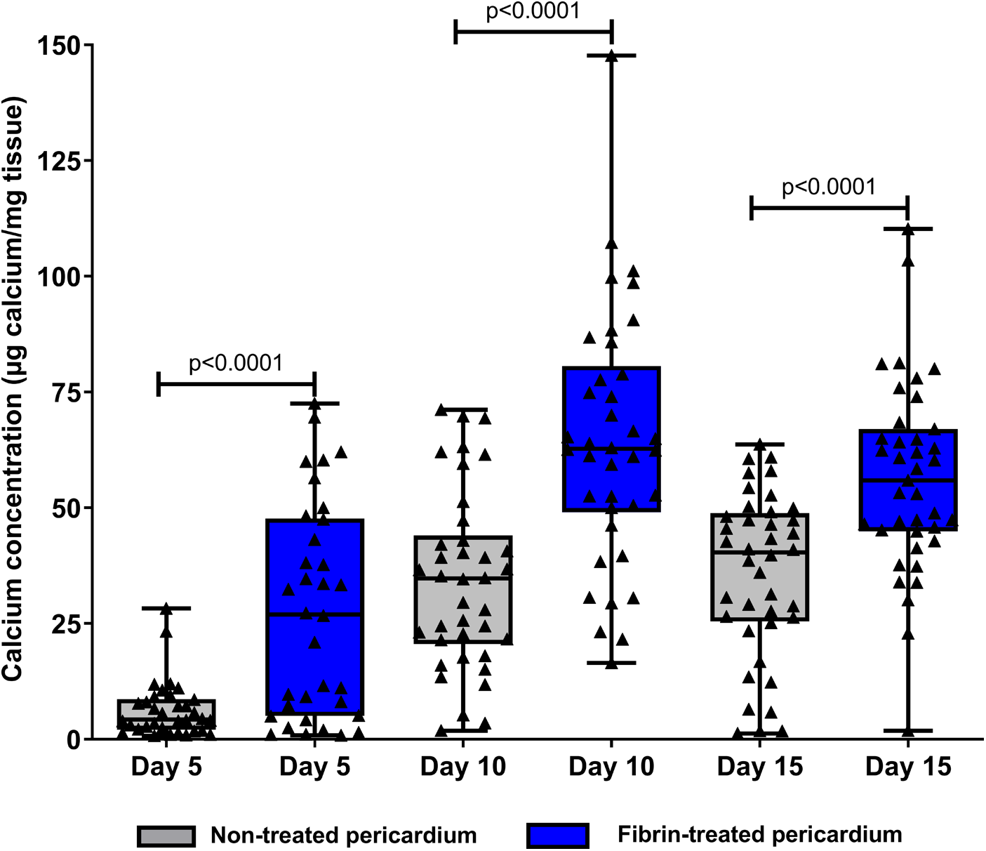 Calcification levels were significantly higher in fibrin-treated bovine pericardium discs compared to those in non-treated bovine pericardium discs (27.45 ± 23.05 µg/mg vs. 6.34 ± 6.03 µg/mg on day 5, 64.34 ± 27.12 µg/mg vs. 34.21 ± 19.11 µg/mg on day 10, and 64.34 ± 27.12 µg/mg vs. 35.65 ± 17.84 µg/mg on day 15; p < 0.001). Von Kossa staining confirmed this finding. In hematoxylin–eosin staining, the bovine pericardium discs were more extensively and deeply colonized by inflammatory-like cells, particularly T lymphocytes (CD3+ cells), when pretreated with fibrin.