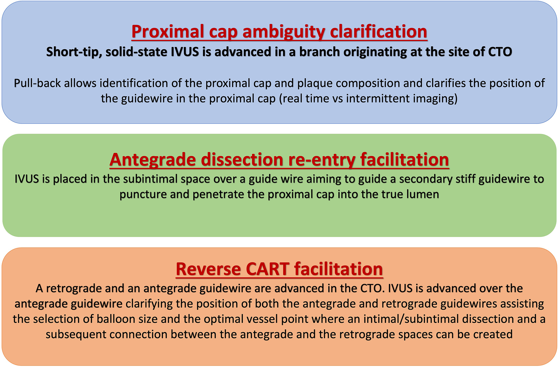 Applications of intravascular ultrasound for facilitating chronic total occlusion crossing. CART, controlled antegrade and retrograde tracking; CTO, chronic total occlusion; IVUS, intravascular ultrasound.