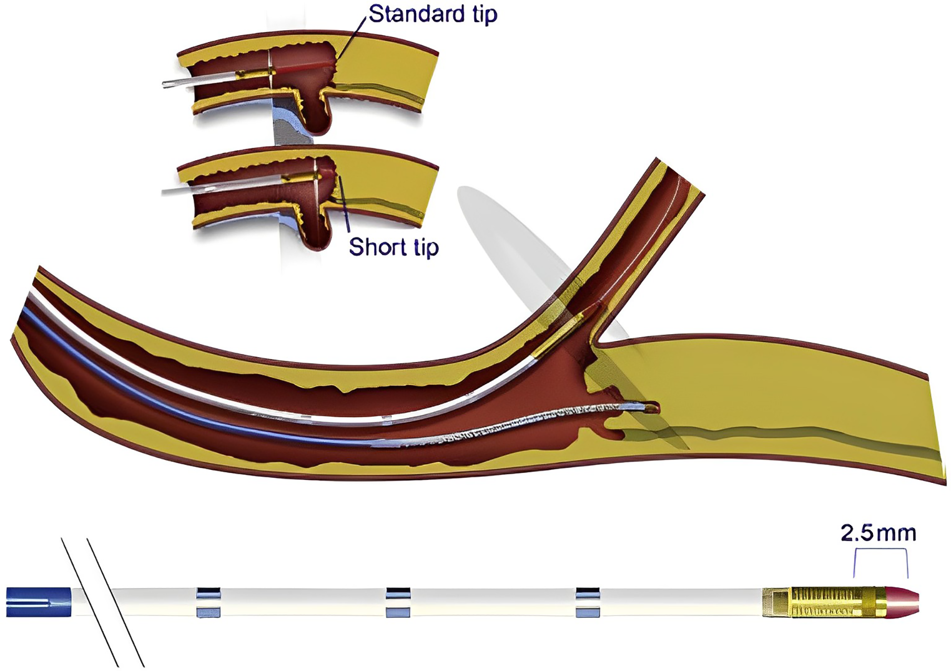 Short tip IVUS catheter entering side branch to guide CTO crossing. With permission from Brilakis ES. Manual of chronic total occlusion interventions a step-by-step approach. Second edition. ed. London: Elsevier/Academic Press; 2018.