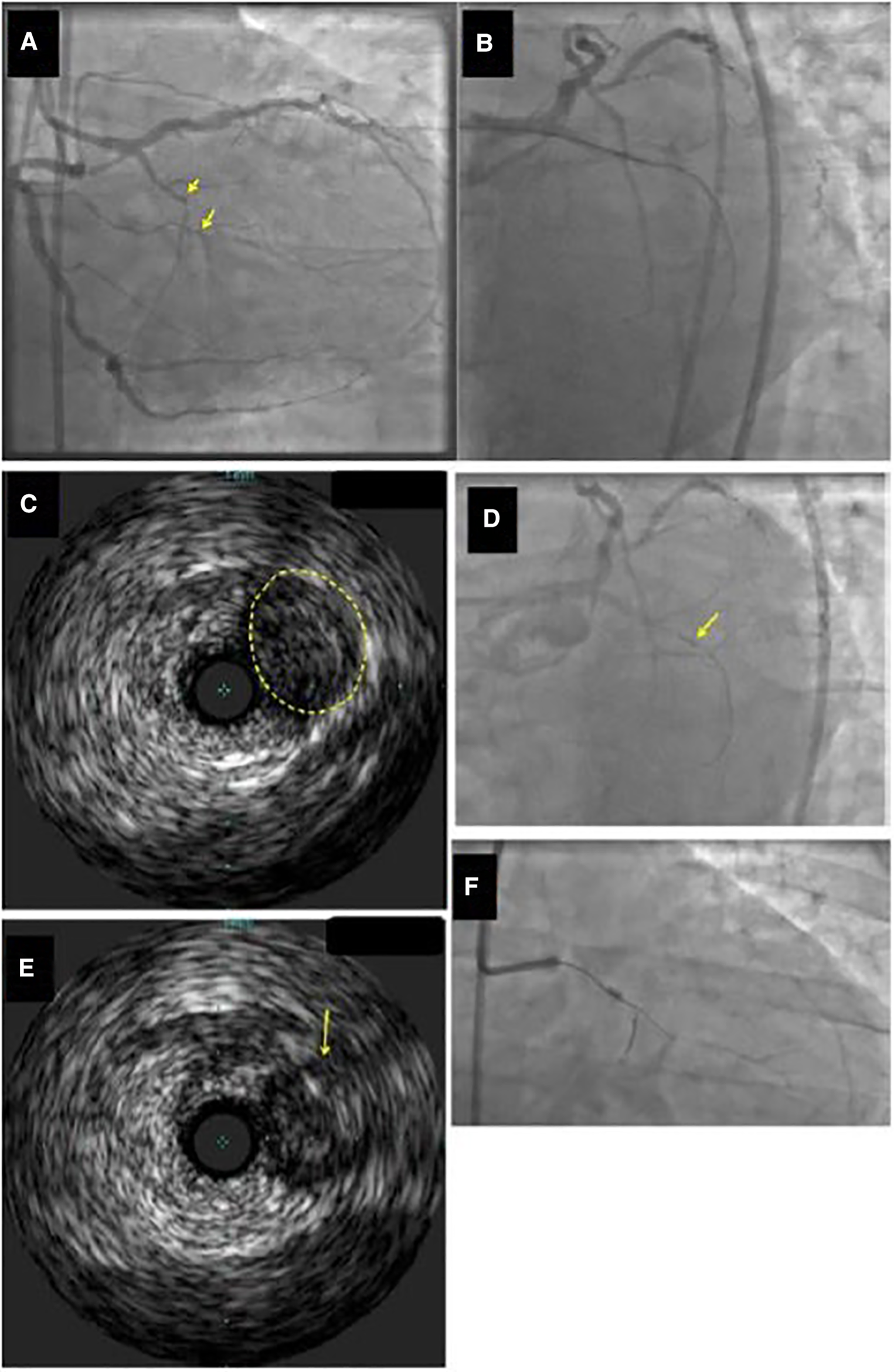 Example of identification of the proximal cap location by intravascular ultrasound (IVUS). (Panel A) Ostial chronic total occlusion (CTO) of the first obtuse marginal branch (arrow). (Panel B) The guidewire kept entering the distal circumflex during antegrade wire escalation approach. (Panel C,D) IVUS demonstrated that the CTO (yellow circle in Panel C) originated proximal (arrow in Panel D) to the distal circumflex's apparent origin. (Panel E) A Confianza Pro 12 guidewire was used for antegrade crossing and its location within the CTO was confirmed by IVUS. (Panel F) Confianza Pro 12 was advanced through the occlusion. Modified with permission from Brilakis ES. Manual of chronic total occlusion interventions a step-by-step approach. Second edition. ed. London: Elsevier/Academic Press; 2018.