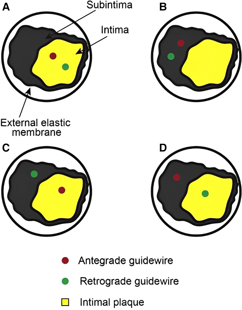 Antegrade and retrograde guidewire positions as assessed by IVUS in reverse CART. (A) Antegrade and retrograde guidewires are both within intimal plaque. This is the ideal scenario to make a connection, after antegrade balloon dilation in the chronic total occlusion body. If needed, retrograde puncture of intimal plaque with a stiffer wire could be performed. (B) Antegrade and retrograde guidewires are both within the subintimal space. This is another ideal condition in which it is easy to create a connection in the same space after balloon dilation. (C) Antegrade guidewire in intimal plaque but retrograde guidewire in subintimal space. This is a very complex situation in which it is crucial to create a medial disruption with proper balloon sizing to create a connection between the two guidewires. In case of failure, it may be possible to advance the antegrade wire distally to enter the subintimal space and create the previous condition (subintimal–subintimal). (D) Antegrade wire in subintimal space but retrograde wire in intimal plaque, often very calcified. This is the most complex situation because antegrade balloon dilation usually enlarges the subintimal space (increasing intramural hematoma) with low probability of creating a connection between the two guidewires. In this situation, the connection is usually achieved by pushing the retrograde wire in the subintimal space (usually with retrograde knuckle technique). In such a complex case, a possible less-used alternative is retrograde balloon dilation (original CART) to create medial dissection and facilitate antegrade guidewire connection with the retrograde guidewire. CART, controlled antegrade retrograde tracking; IVUS, intravascular ultrasound. Modified with permission from Galassi AR, Sumitsuji S, Boukhris M, et al. Utility of intravascular ultrasound in percutaneous revascularization of chronic total occlusions: an overview. JACC Cardiovasc Interv 2016; 9:1979–91, Elsevier. Used with permission from Brilakis ES. Manual of chronic total occlusion interventions a step-by-step approach. Second edition. ed. London: Elsevier/Academic Press; 2018.