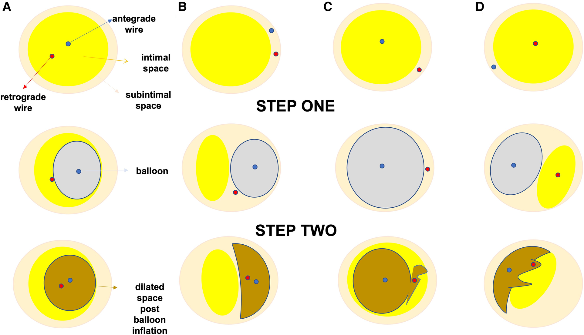The most difficult scenario is the absence of connection between the two guidewires when the antegrade wire is extraplaque, but the retrograde wire is intraplaque. In this scenario, larger antegrade balloon dilations are unlikely to create a connection and resolve the problem. IVUS can help to identify this difficult scenario (Figure 5D) and facilitate the connection between the 2 wires. Retrograde crossing with puncturing with a very stiff guidewire such as Gaia 3rd, Confianza Pro 12 (Akatsuki-Cho, Seto-Shi, Aichi, Japan) or Hornet 14 (Boston Scientific) from intraplaque into the antegrade extraplaque space is reasonable and it is encouraged. Crossing can be performed under direct antegrade IVUS guidance. Some operators recommend to inflate a large balloon over the antegrade guidewire during retrograde puncture attempts in order to avoid antegrade extraplaque space collapse (39). If the previous technique fails, a knuckled Pilot 200 (Abbott Vascular, Santa Clara, California) or Gladius MG (Akatsuki-Cho, Seto-Shi, Aichi, Japan) guide wire can be advanced retrogradely increasing the chances for entering the subintimal space and making connection between the two guidewires. If all attempts fail, change to traditional CART or using the confluent balloon technique can be attempted.