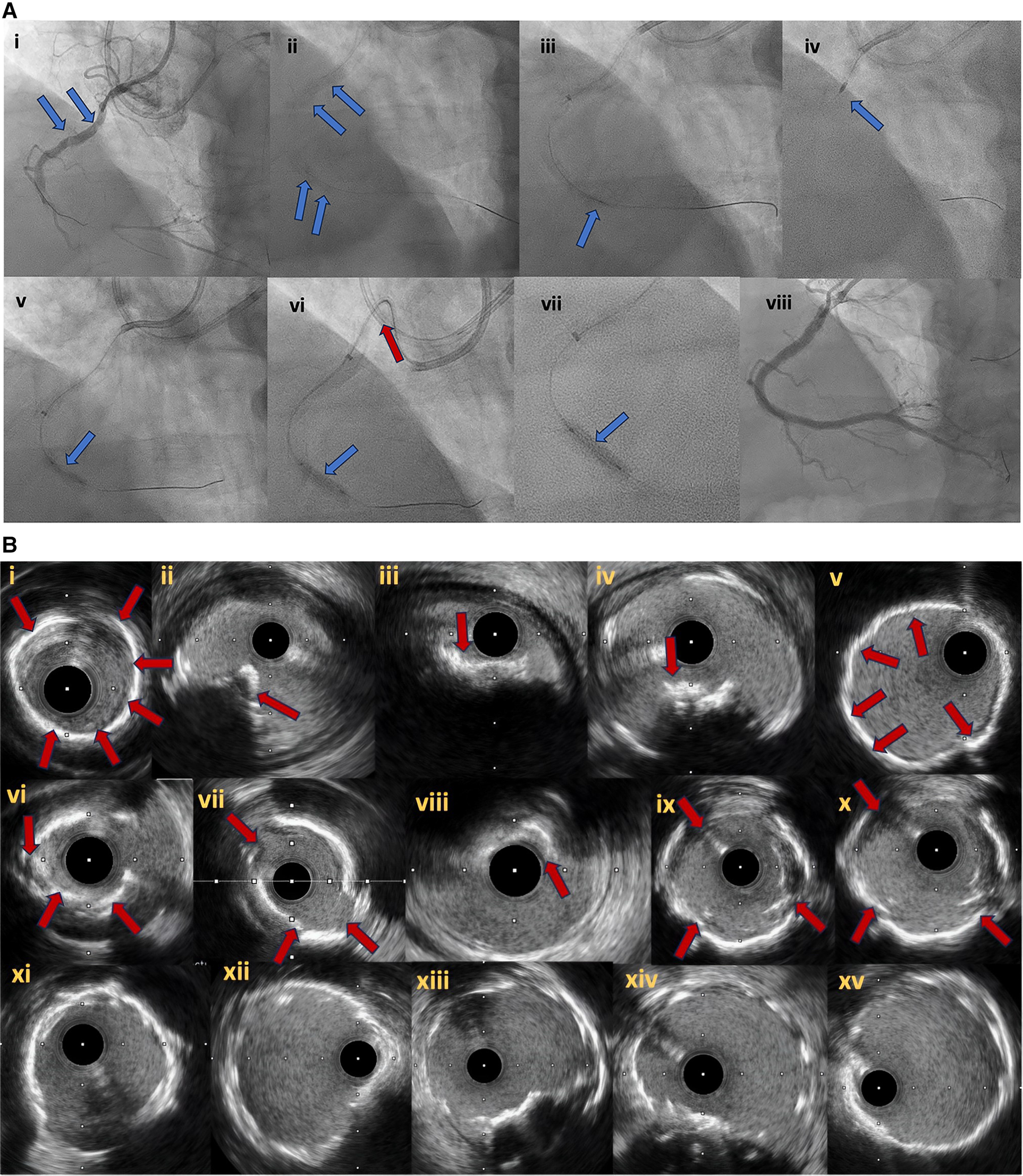 (A) Right coronary artery CTO (6Ai). In (6Ai, Aii) angiographic evidence of heavy calcification is noticed (blue arrows). Grenadoplasty is performed (6Aiii, blue arrow) to facilitate microcatheter and balloon crossing followed by rotational atherectomy. Undilatable lesion (6Av, blue arrow) was successfully treated with intravascular lithotripsy (6Avi, Avii, blue arrows). In (6Avi), the tension to the guide extension and catheter during balloon forward motion due to heavy vessel calcification is noticed (red arrow). Final angiographic result after successful CTO recanalization and plaque modification with combined grenadoplasty, rotational atherectomy and intravascular lithotripsy (6Aviii). (B) intravascular ultrasound pictures. Different modes of calcification including circumferential thick calcification (6Bi, 6Bv) and calcified nodules (6Bii–iv, red arrows). The effect of plaque modification techniques (grenadoplasty, rotational atherectomy and intravascular lithotripsy) is demonstrated in (6Bvi–x). Final intravascular images after successful stents insertion (6Bxi–xv).