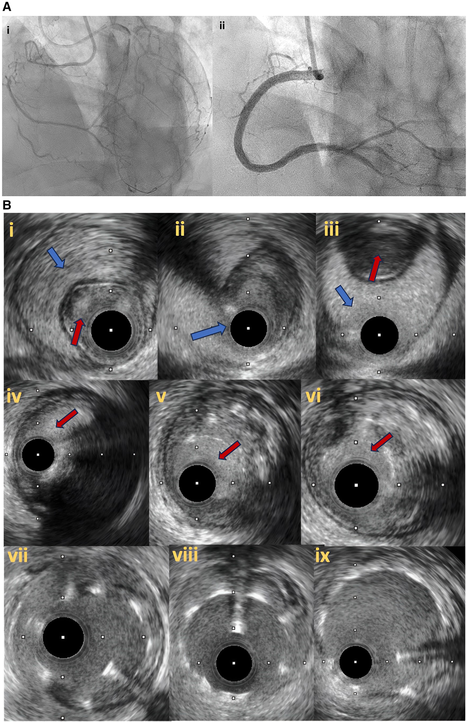 (A) Right coronary artery total occlusion revascularization with antegrade dissection reentry technique (7Ai–ii). (B) Intravascular ultrasound pictures after successful distal true lumen reentry and CTO recanalization. In (7Bi), intraluminal wire position (red arrow) with large subintimal haematoma is noticed. In (7Bii), the transition from true lumen into subintimal space is noticed (blue arrow), whilst in (7biii) the wire is in the subintimal space (blue arrow) that compresses the true lumen (red arrow). In (7Biv–vi), intraplaque wire tracking is noticed. Final IVUS images after stent deployement (7bvii–ix).