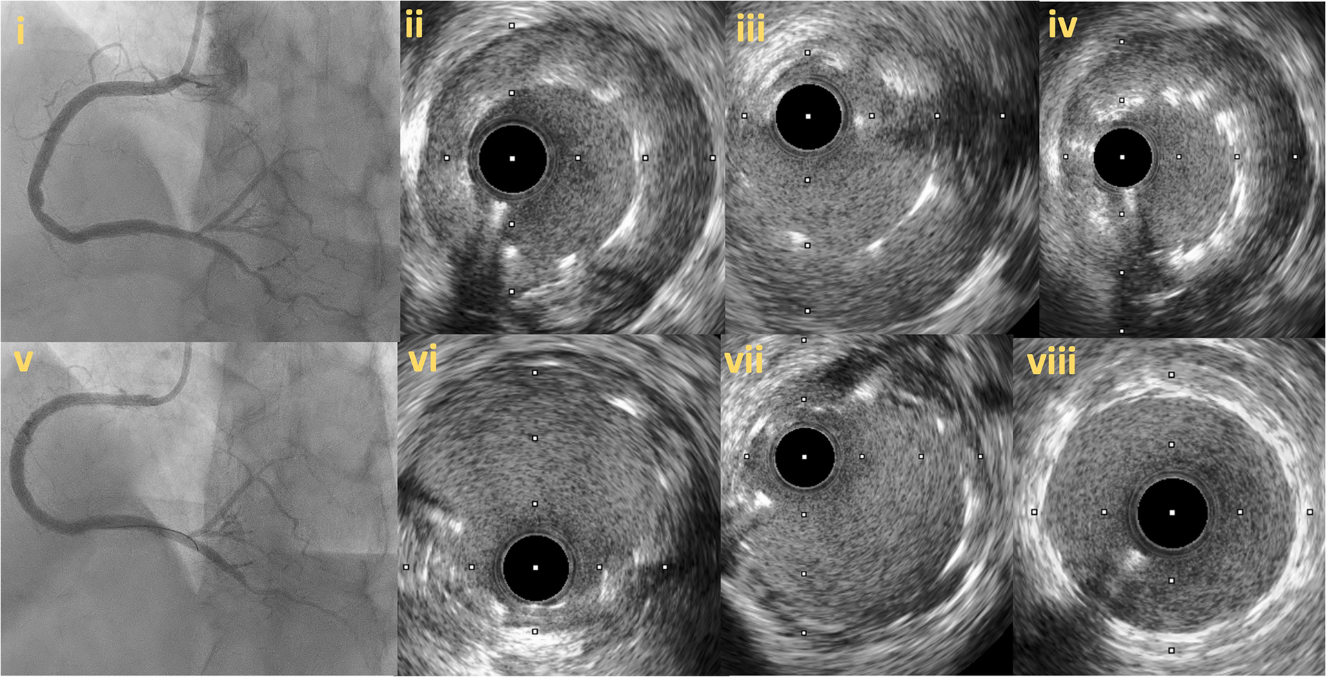 Follow up angiography in patient illustrated in figure 7, 3 months after successful RCA CTO PCI (8i). IVUS demonstrates significant stent vessel size mismatch and significant malapposition due to subintimal haematoma healing and vessel positive remodeling after successful PCI (8ii–iv). Angiographic (8v) and IVUS images (8vi–viii) after stent optimization to correct stent-vessel size mismatch and malapposition.