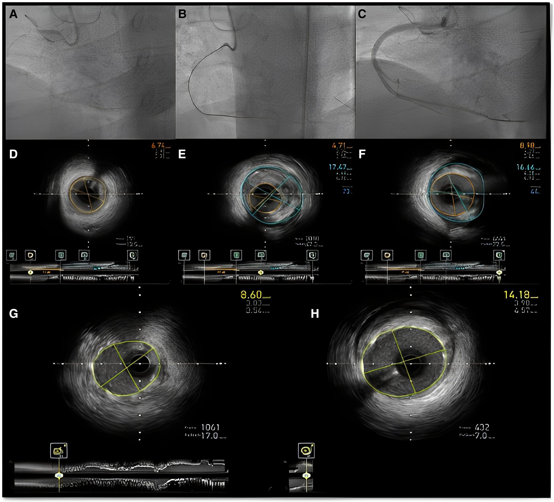 Intravascular imaging (IVUS) guided chronic total occlusion (CTO) percutaneous coronary intervention; (A) initial angiography with contralateral injections to define CTO lesion characteristics; (B) successful antegrade wire crossing; (C) final angiographic result after IVUS guided drug eluting stent (DES) implantation; (D) distal landing zone with reference cross sectional area and diameter estimated at 3 mm; (E) CTO segment cross-sectional area and reference diameter estimated at 4.5 mm; (F) proximal landing zone with reference cross sectional area and diameter estimated at 4.5 mm. The overall lesion length requiring stent coverage from distal landing zone was estimated at 65 mm and therefore two overlapping DES 3.0 × 38 mm and 4.0 × 38 mm were successfully implanted and post-dilated with 3.5 and 4.5 mm non-compliant balloons based on media to media reference diameters as per IVUS measurements; (G) distal stent cross-sectional area with excellent absolute (>5.5 mm2) and relative expansion (>100%); (H) proximal stent cross-sectional area with excellent relative expansion (>100%). Used with permission by Elsevier. Kalogeropoulos AS, Alsanjari, O, Davies, JR. et al. Impact of Intravascular Ultrasound on Chronic Total Occlusion Percutaneous Revascularization. Cardiovasc Revasc Med. 2021; 33:32–40.