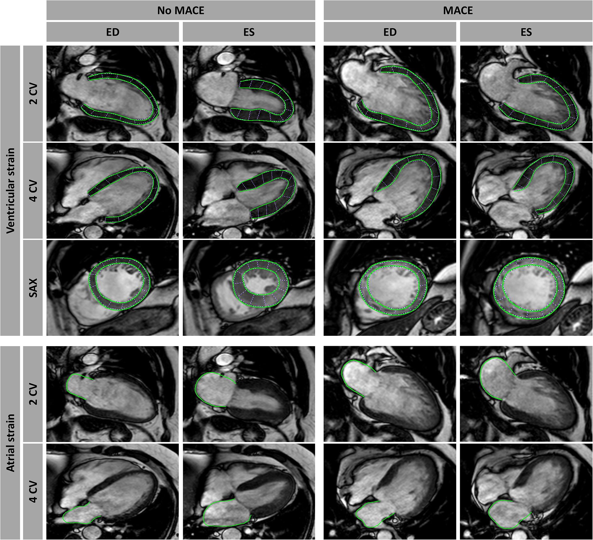 Cardiovascular magnetic resonance-feature tracking (CMR-FT). CMR-FT analyses in a patient with and without a major adverse cardiac event (MACE). Ventricular analyses were performed in long-axis 2- and 4-chamber views (CV) as well as in short-axis (SAX) stacks including basal, mid-ventricular, and apical slices, with only an exemplary mid-ventricular slice illustrated in this figure. Atrial strain analyses were performed in long-axis 2- and 4 CV images as well. Myocardial border delineations are presented in end diastole (ED) and end systole (ES).