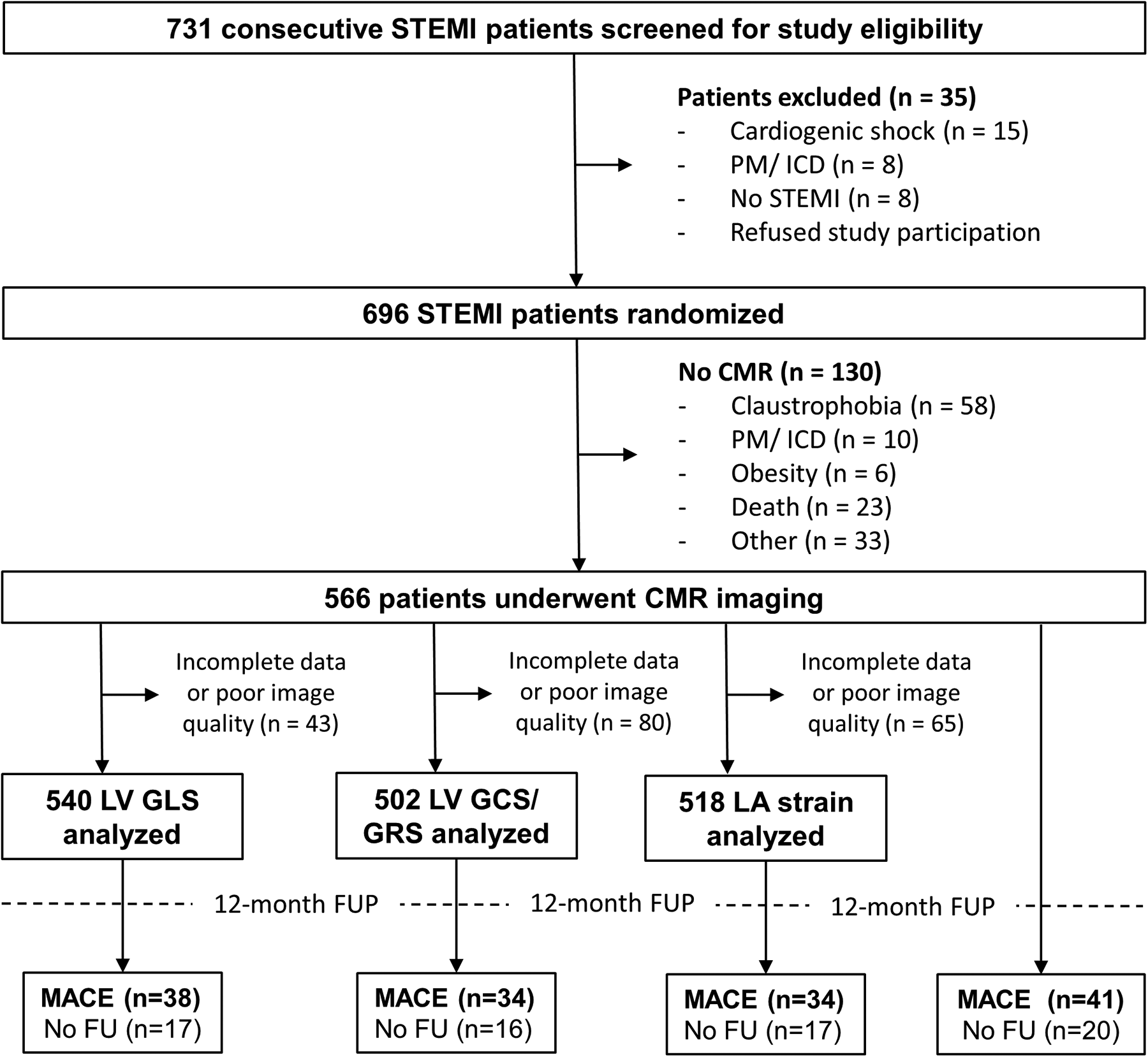 Study flowchart. A total of 696 of 731 eligible patients with ST-segment elevation myocardial infarction (STEMI) undergoing primary percutaneous coronary intervention (PCI) were enrolled within this study and 566 patients underwent cardiovascular magnetic resonance (CMR) imaging. ICD, implantable cardioverter defibrillator; GLS, global longitudinal strain; GCS, global circumferential strain; GRS, global radial strain; LA, left atrial; LV, left ventricular; MACE, major adverse cardiac events; PM, pacemaker.