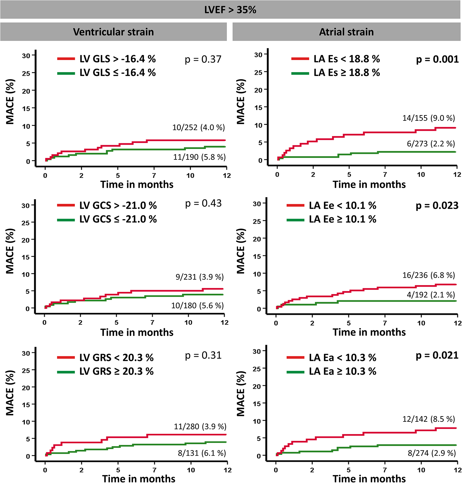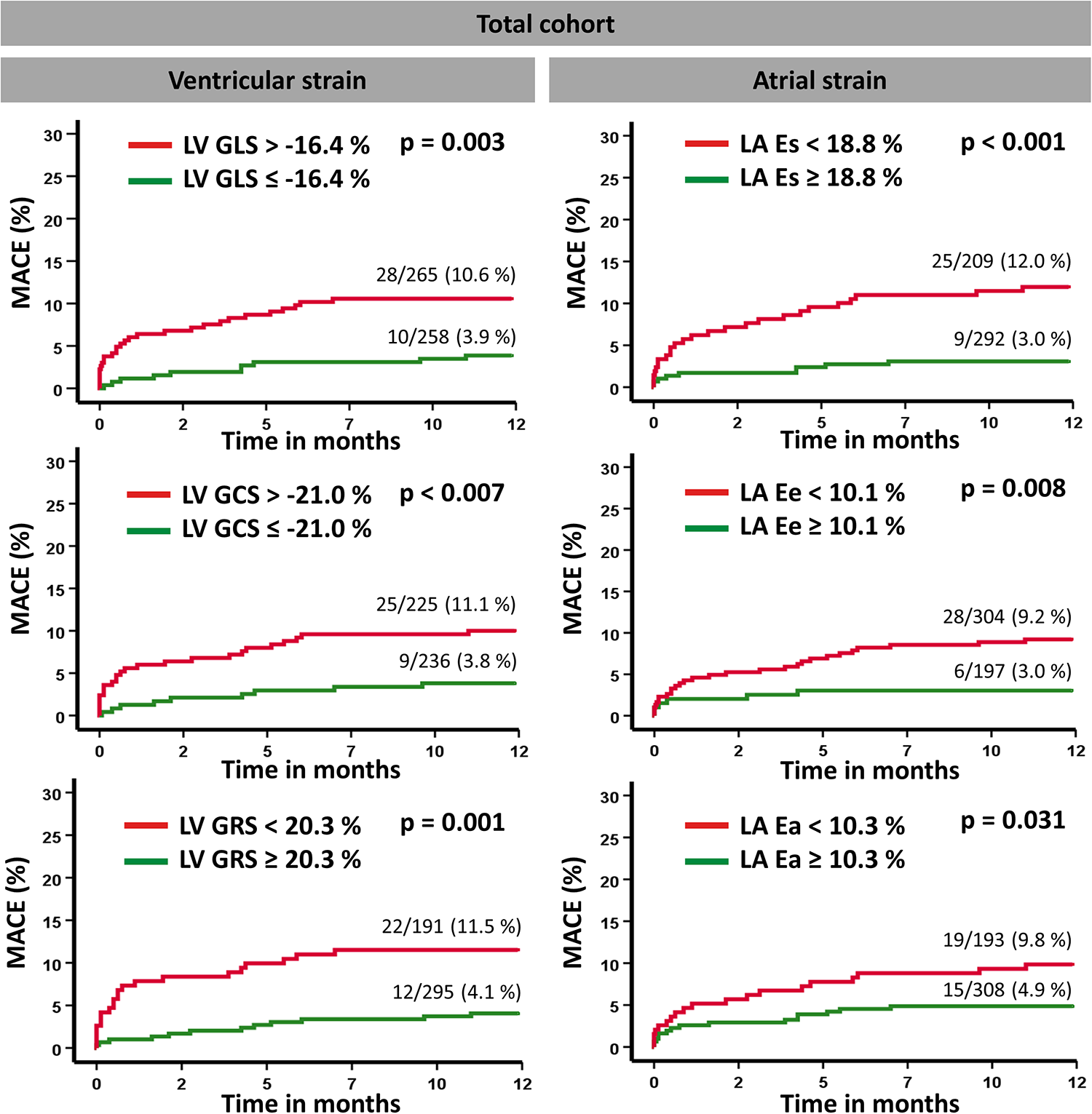 Overall, 566 STEMI patients enrolled in the CONDITIONING-LIPSIA trial including pre- and/or postconditioning treatment in addition to conventional percutaneous coronary intervention underwent CMR imaging in median 3 days after primary percutaneous coronary intervention. CMR-based left atrial (LA) reservoir (Es), conduit (Ee), and boosterpump (Ea) strain analyses, as well as left ventricular (LV) global longitudinal strain (GLS), circumferential strain (GCS), and radial strain (GRS) analyses were carried out. Previously identified cutoff values were revalidated for risk stratification. Major adverse cardiac events (MACE) comprising death, reinfarction, and new congestive heart failure were assessed within 12 months after the occurrence of the index event.