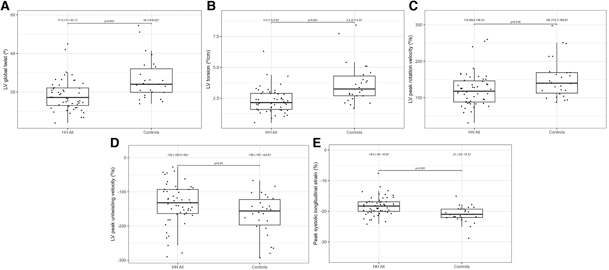 Figure 2. Lv global twist (A), LV torsion (B), LV peak rotation velocity (C), LV peak untwisting velocity (D), and peak systolic longitudinal strain (E) values between all HH patients and the control group. The dots show the values obtained by each person analyzed. * Data are presented as medians (25th–75th percentile).