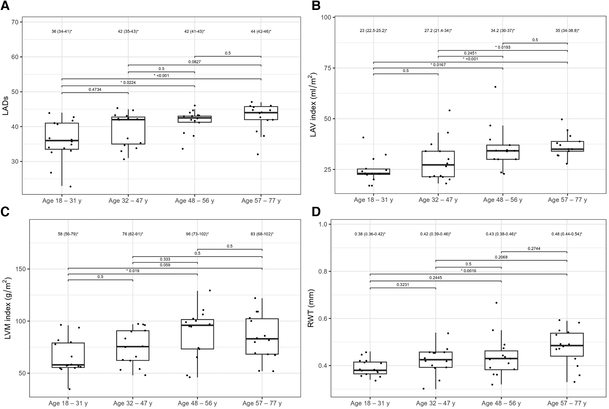 Figure 7. LADs (A), LAV index (B), LVM index (C), and RWT (D) values between the HH patients stratified by their age. The dots show the values obtained by each person analyzed. The values above the brackets correspond to the p-value. * Data are presented as medians (25th–75th percentile).