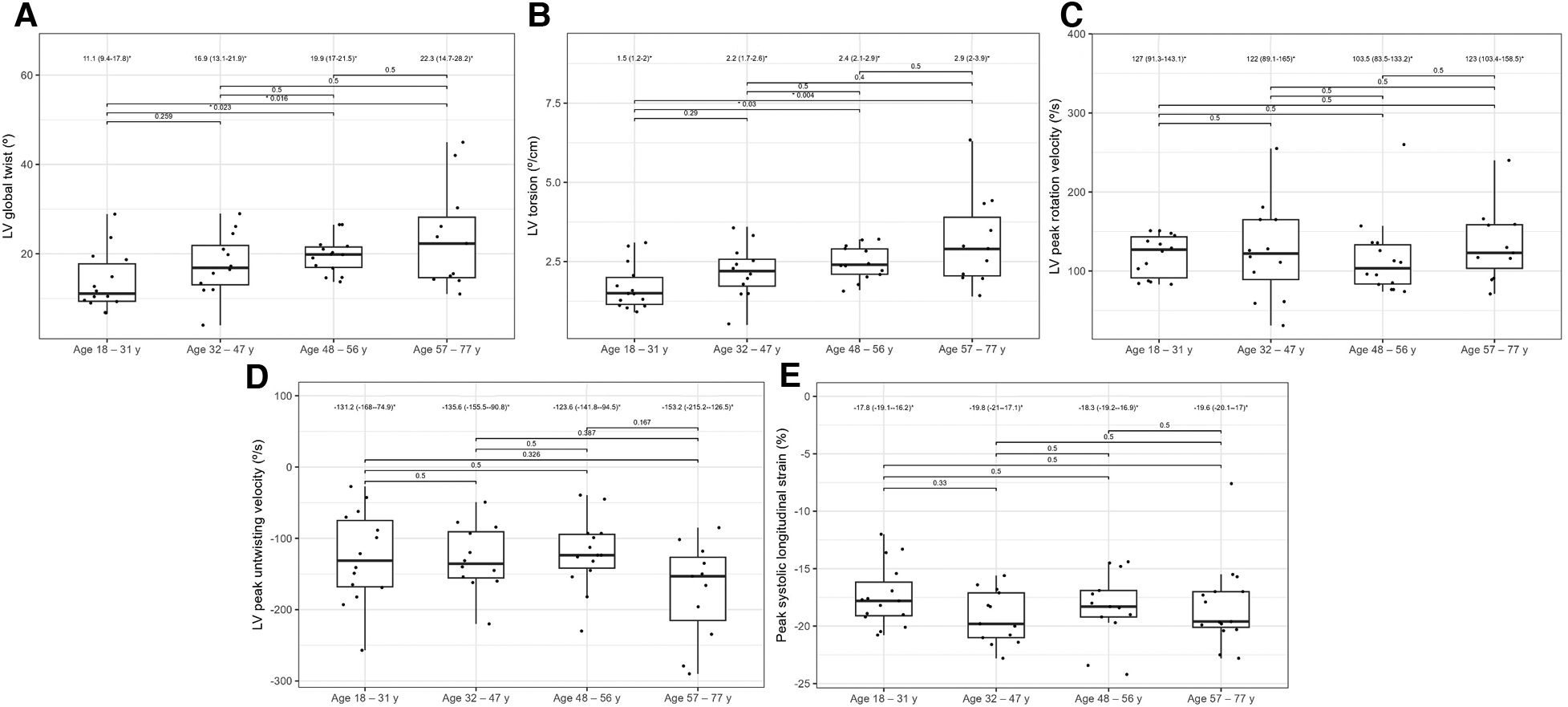 Figure 8. Graphs showing comparisons of LV global twist (A), LV torsion (B), LV peak rotation velocity (C), LV peak untwisting velocity (D), and peak systolic longitudinal strain (E) values between the HH patients stratified by their age. The dots show the values obtained by each person analyzed. The values above the brackets correspond to the p-value. * Data are presented as medians (25th–75th percentile).