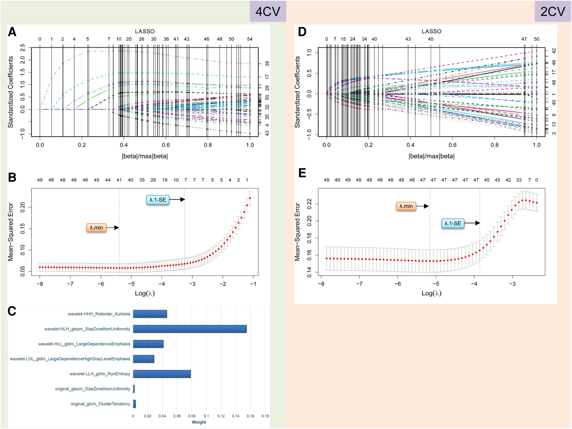 Radiomics feature selection performed using LASSO logistic regression for establishing the rad score. (A–C) and (D–E) describe the results of radiomics analysis for 4CV and 2CV images, respectively. In 4CV analysis, seven features are selected by identifying the best λ with λ.1-SE in the LASSO model (A,B), and their weights are listed in (C). In 2CV analysis, no features can be selected with the optimal λ values (D,E). LASSO, least absolute shrinkage and selection operator; 4CV, four-chamber view; 2CV, two-chamber view; λ, penalty regularization parameter; λ.min, minimum criteria; λ.1-SE, 1-standard error of the minimum criteria.