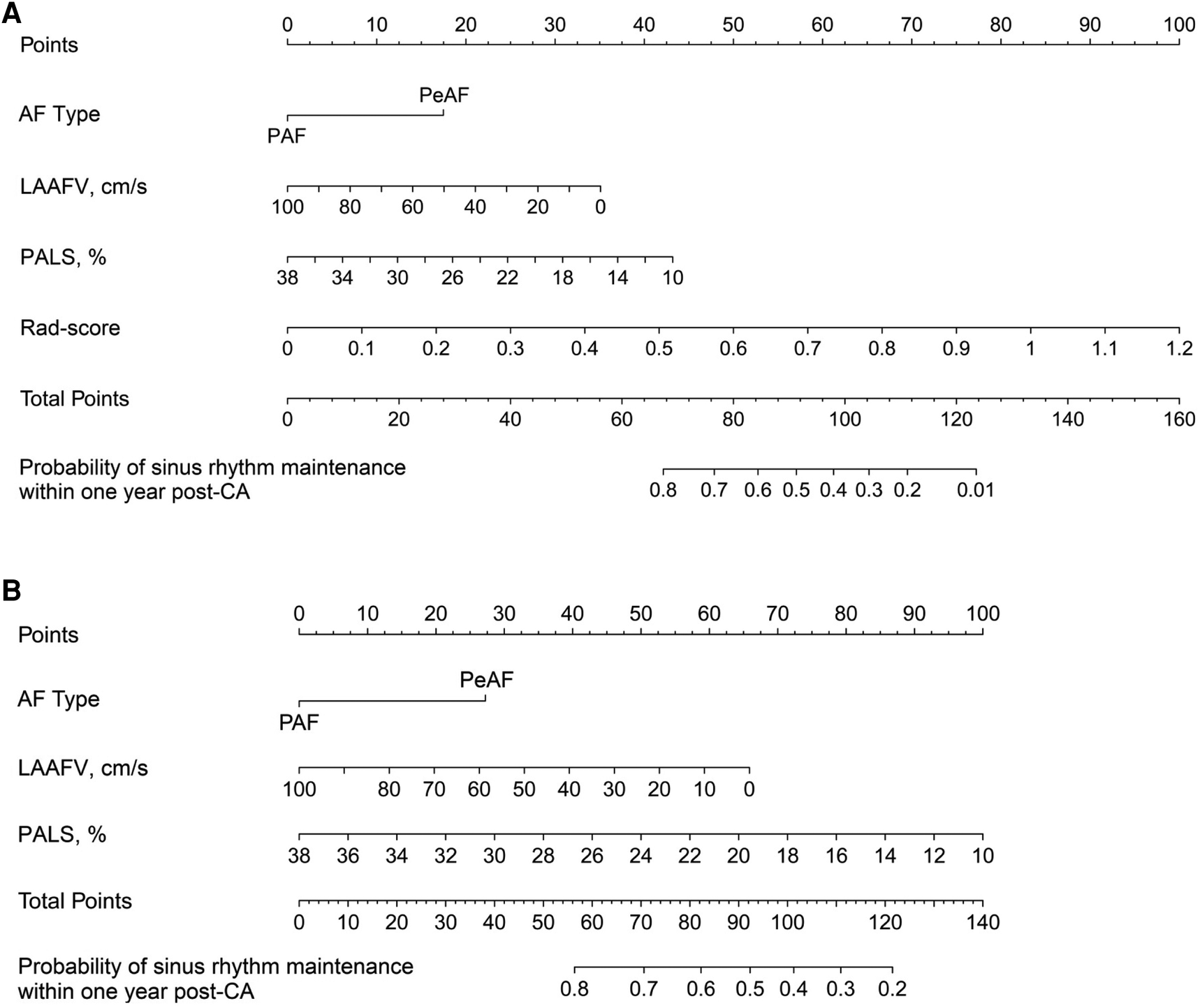 Using the chosen predictors and the rad score, we developed a radiomics nomogram, which enabled a preoperative estimation of the likelihood of sinus rhythm maintenance within 1 year following CA (Figure 4A). In order to provide a comparative perspective, a clinical nomogram was also constructed. This was done using the same selected predictors, but without including the rad score (Figure 4B).
