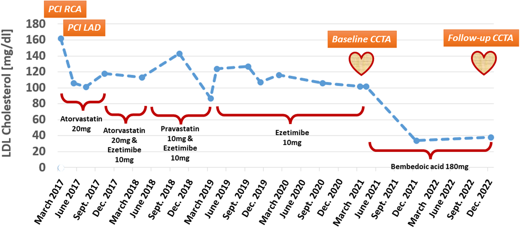 Lipid-lowering treatment was changed to 20 mg of atorvastatin per day, resulting in an LDL-cholesterol of 101 mg/dl in July 2017 and 118 mg/dl in October 2017. Since the target value of <70 mg/dl recommended by previous guidelines (10) could not be achieved, 10 mg of ezetimibe was added to the lipid-lowing medication, without significantly affecting LDL-cholesterol, which was measured at 113 mg/dl during April 2018. Figure 1 shows the serial LDL-cholesterol values between March 2017 and December 2022.