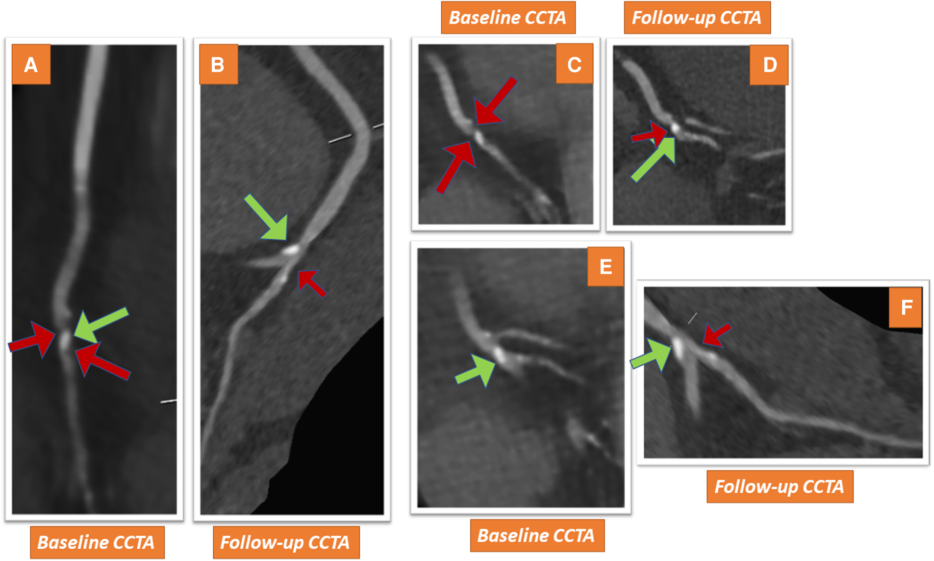 CCTA shows a non-calcified plaque and calcified components in the distal RCA of the patient (red and green arrows in A–C, pointing to low-attenuation and calcified plaque components, respectively). The lesion detected in the distal RCA reveals signs of favorable plaque component modification with follow-up CCTA after 20 months, exhibiting similar calcified plaque (green arrows in D–F), whereas low-attenuation plaque components are now hardly detectable (red arrows in D–F).