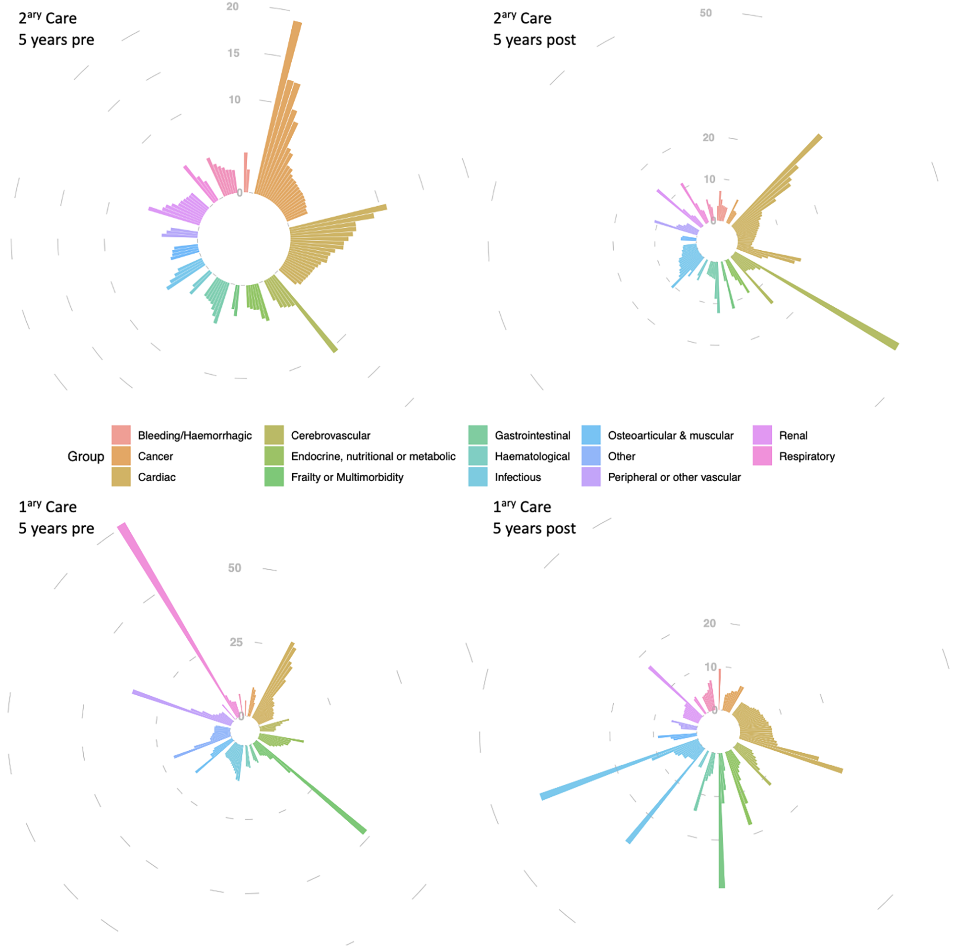 Top 100 reasons for hospitalisation (2ary care) and GP consultations (1ary care) in atrial fibrillation patients, compared to controls, within 5 years before and in the 5 years after new-onset AF diagnosis. The four iris-plots represent the top reasons (displayed as relative risk vs. controls) for healthcare utilization (primary and secondary care) prior and post new-onset AF. The 14 diagnostic groups are organized by different colours (legend) and clockwise as follows, as per the upper-left iris-plot: bleeding/haemorrhagic (12 h), cancer (1 h to 2 h), cardiac (3–4 h), cerebrovascular (5 h), “endocrine, nutritional or metabolic” & “frailty or multimorbidity” (6 h), gastrointestinal (7 h), haematological and infectious (8 h), osteoarticular & other (9 h), “peripheral other vascular” (10 h), renal (11 h), and respiratory (11–12 h). Different scales were used in the 4 iris-plots to accommodate with the different range of relative risks.