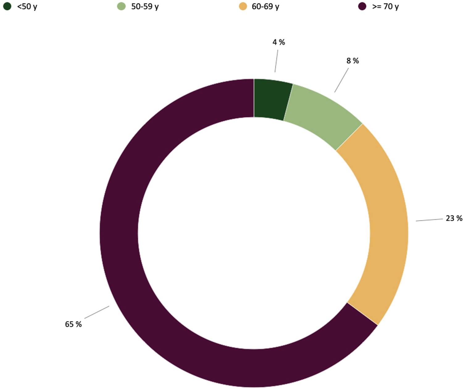 Out of 411,375 patients entered into the EPICARD Database during the study period, a population still including a very large amount of patients operated on for CABG only, we considered 101,070 valvular heart disease patients and included 72,375 SAVR (mean age 71.4 ± 12.2 years) 26,185 of which were women (36.1%). SAVR was performed as a redo surgery in 5,434 cases (7.5%). SAVR was an isolated procedure in most cases and was associated with another valve procedure in 7,123 cases (9.8%) or with CABG in 15,621 cases (21.6%). A total of 63,466 patients (87.7%) received a BPV and 8,909 patients received a MPV. Therefore we observed a mechanical vs. biological prosthesis ratio (MBPR) of 0.14 for the overall population. Patient's preoperative characteristics for each prosthetic valve type are detailed in Table 1 and overall age distribution where percentages are representative of the proportion of patients from our population in each class of age is presented in Figure 2.