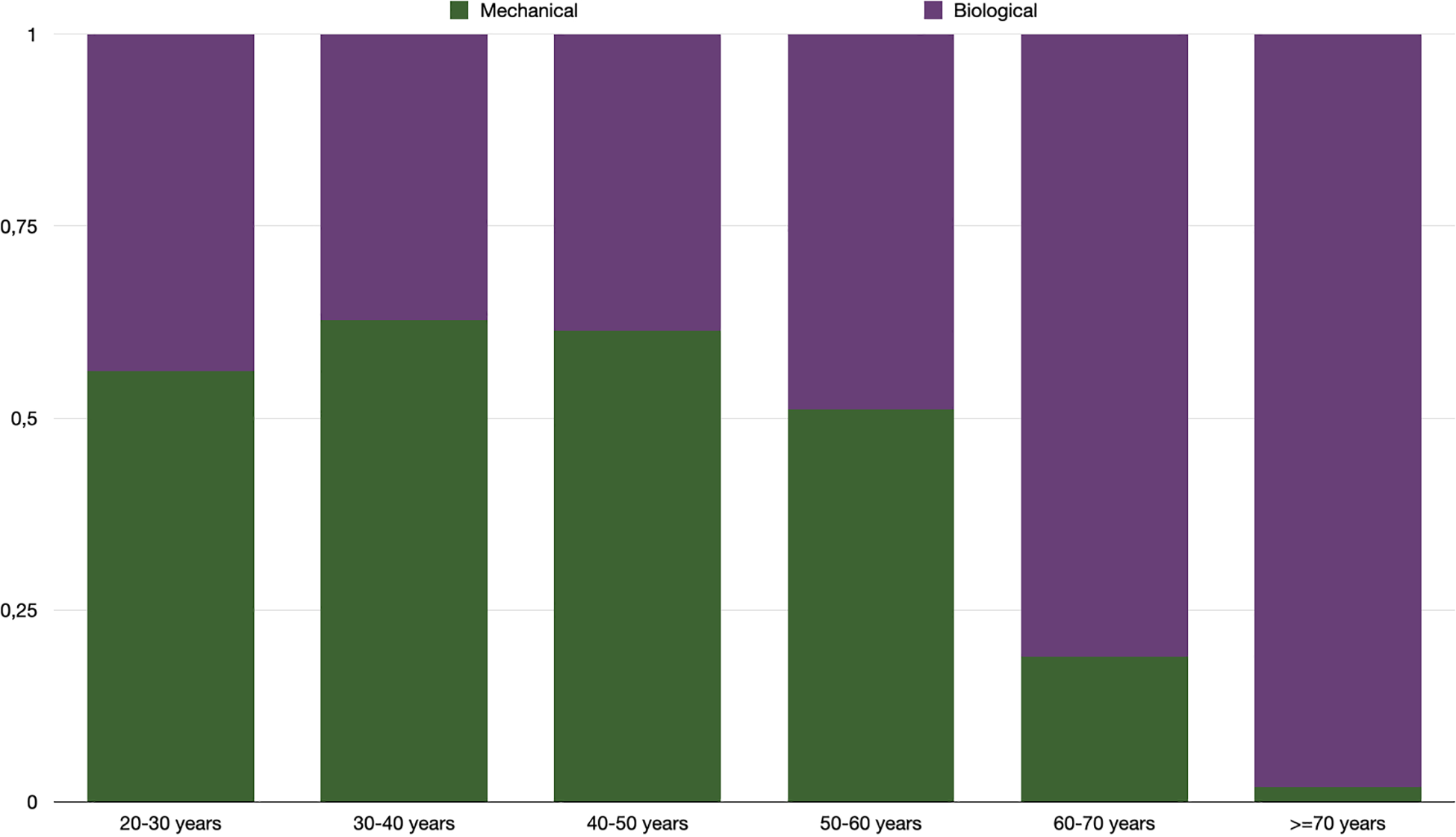 Proportion of SAVR with mechanical versus biological prosthetic valve per class of age during the overall study time (2007–2022).