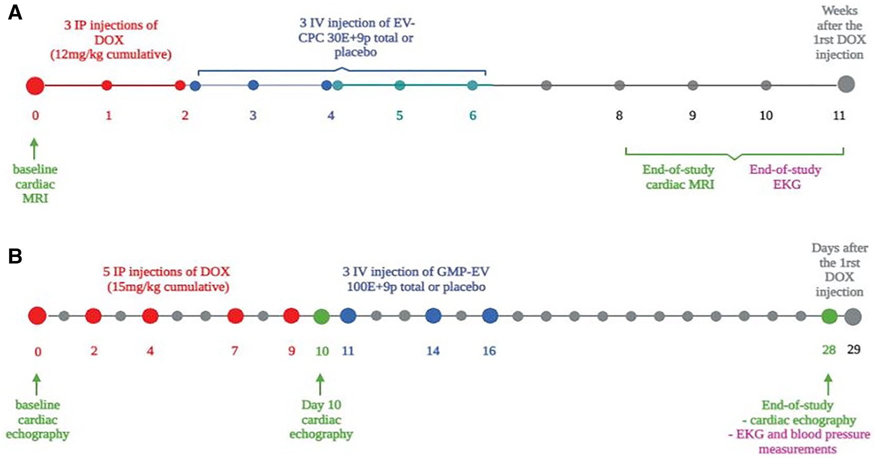 Immuno-competent mice received intra-peritoneal injections (IP) of doxorubicin (DOX) (4 mg/kg each; cumulative dose: 12 mg/kg) and were then intravenously (IV) injected three times with EV-CPC (total dose: 30 billion). Cardiac function was assessed 9–11 weeks later by cardiac magnetic resonance imaging (CMR) using strain as the primary end point. Then, immuno-competent rats received 5 IP injections of DOX (3 mg/kg each; cumulative dose 15 mg/kg) followed by 3 equal IV injections of GMP-EV (total dose: 100 billion). Cardiac function was assessed by two dimensional-echocardiography.