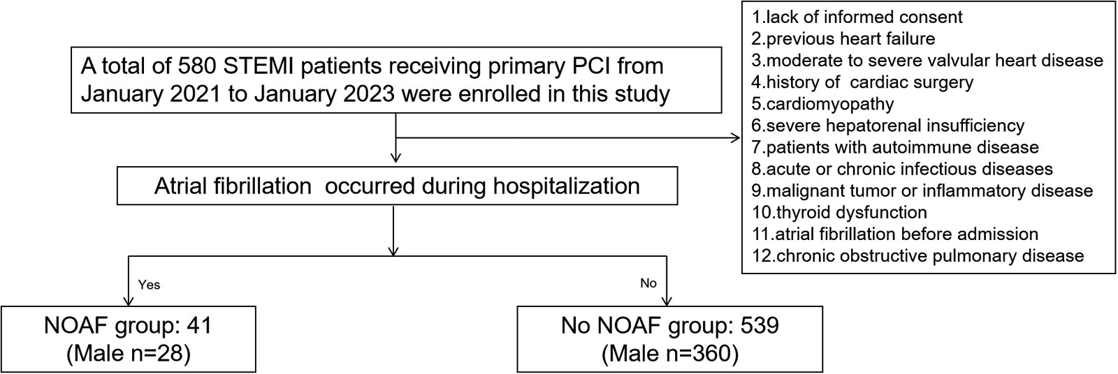 A total of 580 patients with STEMI undergoing primary PCI were consecutively recruited between January 2021 and January 2023. These patients were then categorized into two groups: the NOAF group and the no NOAF groups based on the presence of NOAF during admission. The concentration of sST2 in blood samples was measured in all patients. The clinical data from the two groups were prospectively analyzed to investigate the predictive factors of NOAF in patients with STEMI undergoing primary PCI.