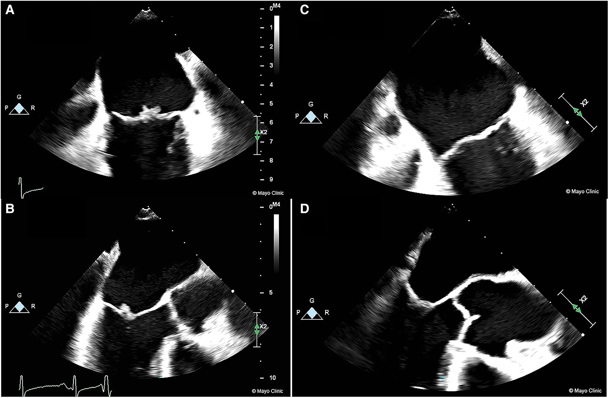Transesophageal echocardiography (TEE) showing the soft mobile echodensity at the tip of both leaflets in a “kissing-lesion” appearance.
