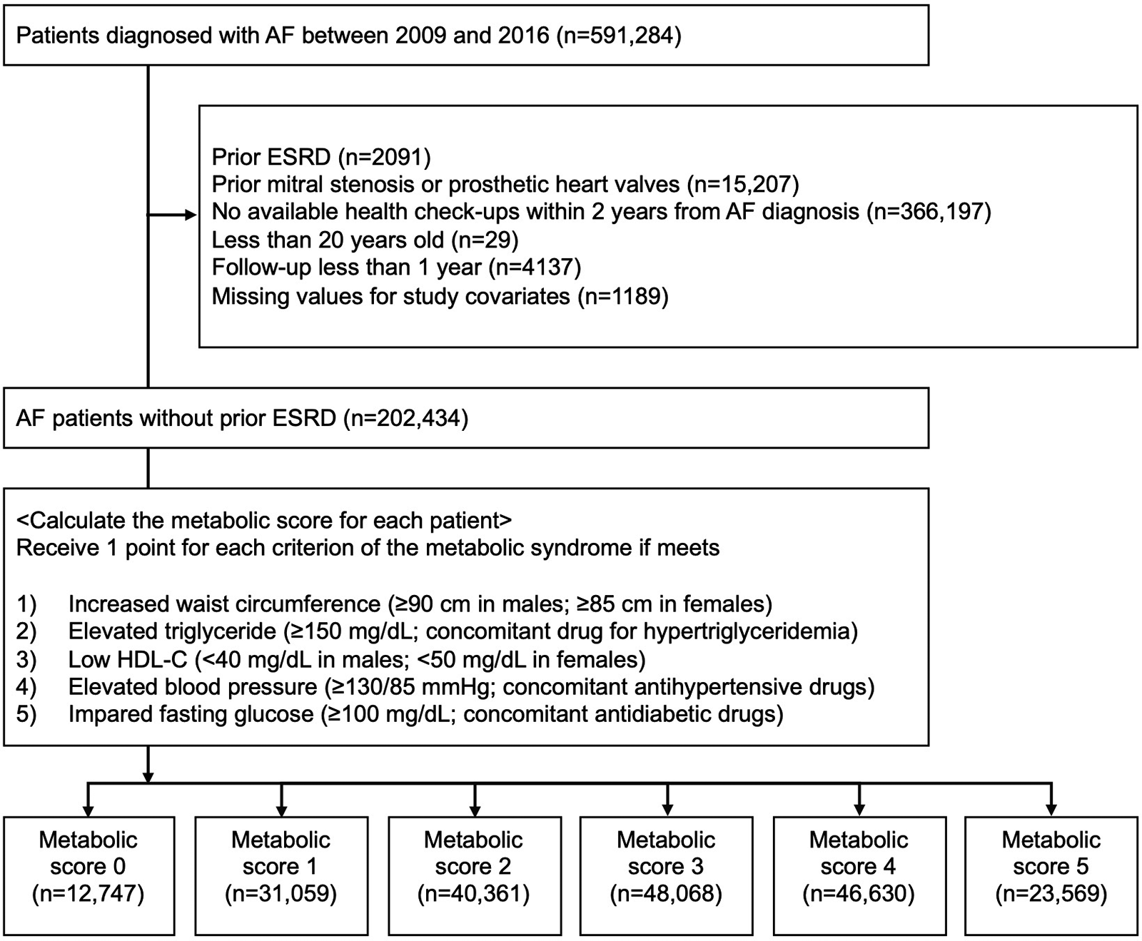 The flowchart of the study population. The study population was divided into 6 groups (MS0–MS5) according to each metabolic score (0–5). AF, atrial fibrillation; ESRD, end-stage renal disease; HDL-C, high-density lipoprotein cholesterol.