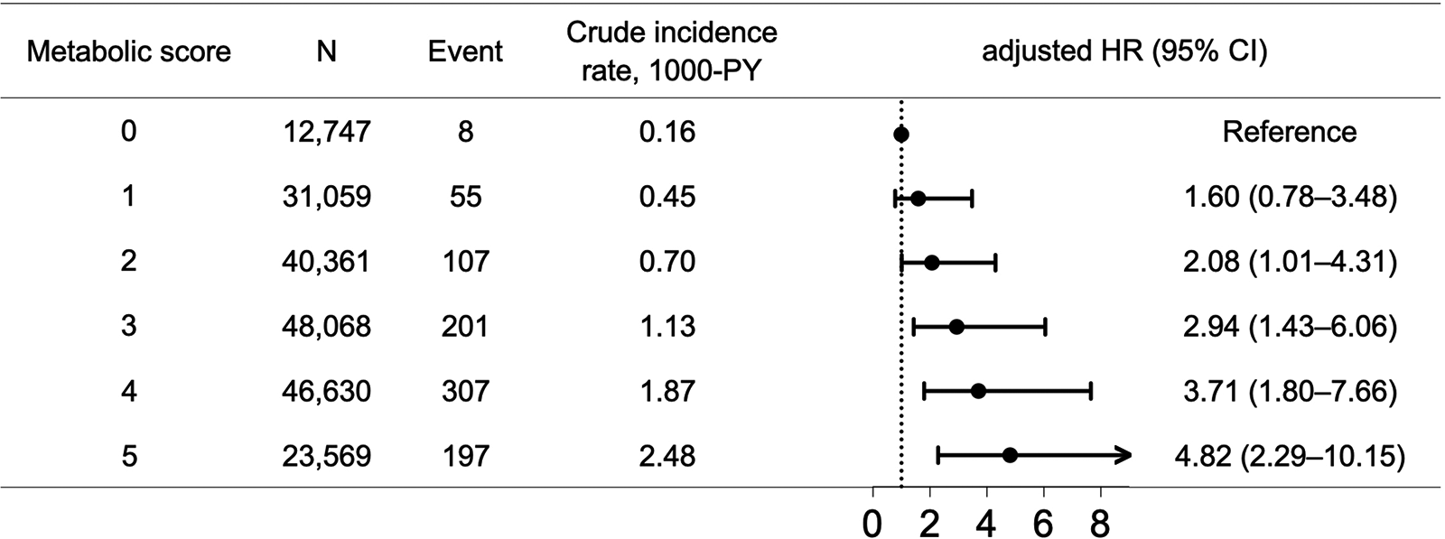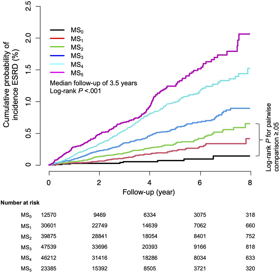 There were 12,747, 31,059, 40,361, 48,068, 46,630, and 23,569 patients for MS0–MS5, respectively. Compared with MS0, MS5 had a higher CHA2DS2-VASc score (3.8 vs. 1.0) (P < .001). During a median follow-up of 3.5 years, compared with MS0, MS1–MS5 were associated with a gradually increasing incidence of end-stage renal disease, in relation to an increase in the metabolic score, (log-rank P < .001). After multivariate adjustment, a higher metabolic score was associated with a greater risk of incident end-stage renal disease: adjusted hazard ratio [95% confidence interval] = 1.60 [0.78–3.48], 2.08 [1.01–4.31], 2.94 [1.43–6.06], 3.71 [1.80–7.66], and 4.82 [2.29–10.15], for MS1–MS5, respectively.