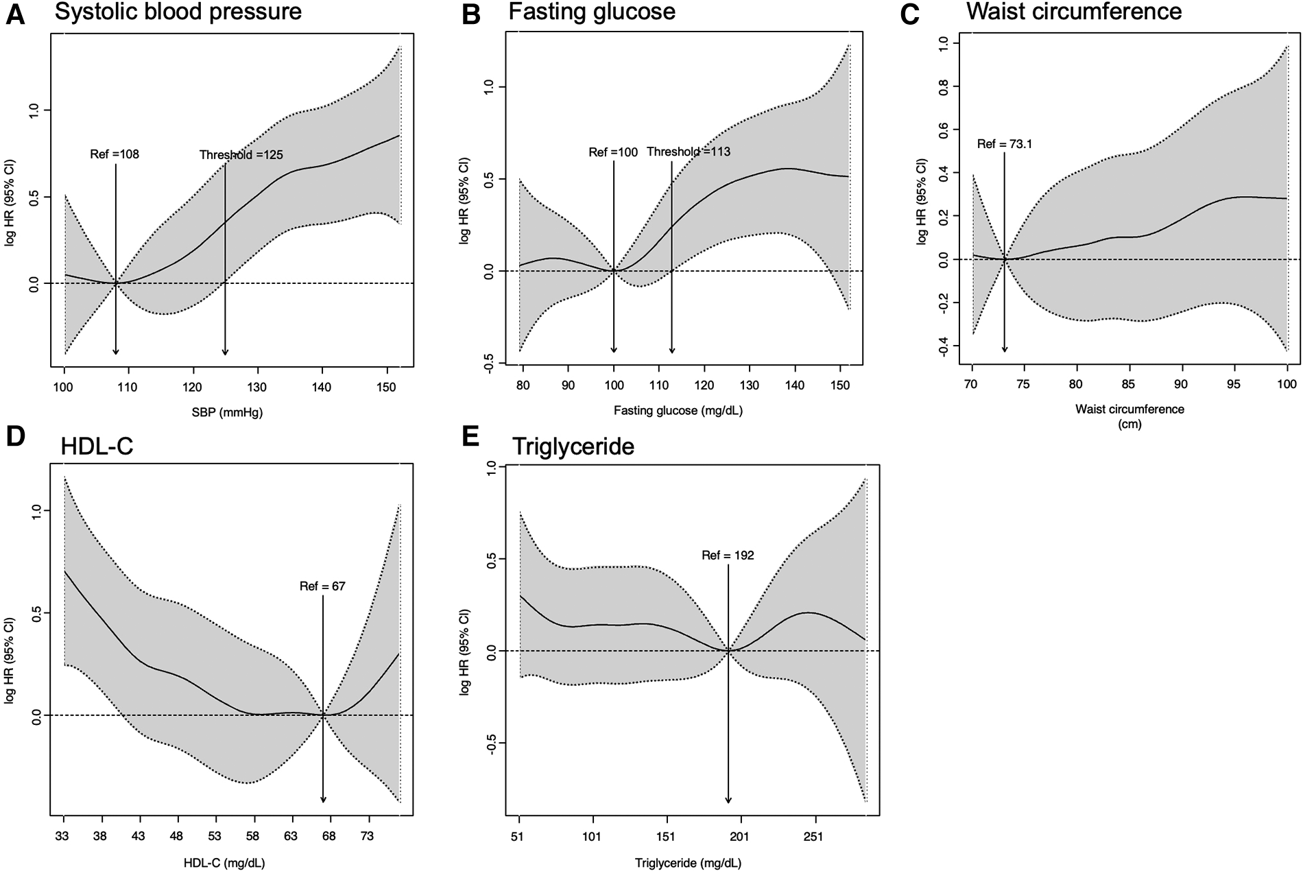 To investigate the impact of each diagnostic criterion of metabolic syndrome on incident ESRD, the study population was divided according to the presence or absence of each diagnostic criterion of metabolic syndrome. The risk of incident ESRD was compared across the five groups based on patients meeting each diagnostic criterion. The impact of systolic blood pressure and fasting blood glucose levels on the incident ESRD risk was visualized using cubic spline curves.