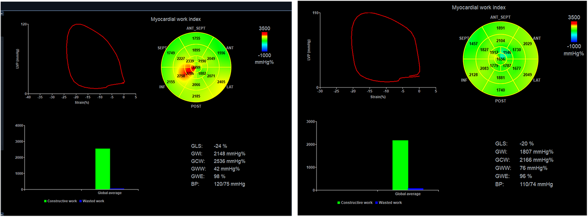 Through the LV PSL, MWIs were obtained automatically as described using data from LV strain, valvular event times, and systolic BP (Figure 1). Subsequently, we derived several MWIs. GWI represented the total work within the LV PSL area, which was computed from closure and opening of the mitral valve. GCW denoted the work during shortening in systole, and addition of work during lengthening in isovolumic relaxation. GWW represented work during lengthening in systole, and additional work required during shortening in isovolumetric relaxation. Moreover, GWE was computed as the sum of constructive work in all LV segments, divided by the sum of constructive and wasted work in all LV segments. GWI, GCW, and GWW are presented as mmHg %. GWE is presented as a percentage. Normal reference values were employed for preserved-value and impaired-value definitions of MWIs (20).