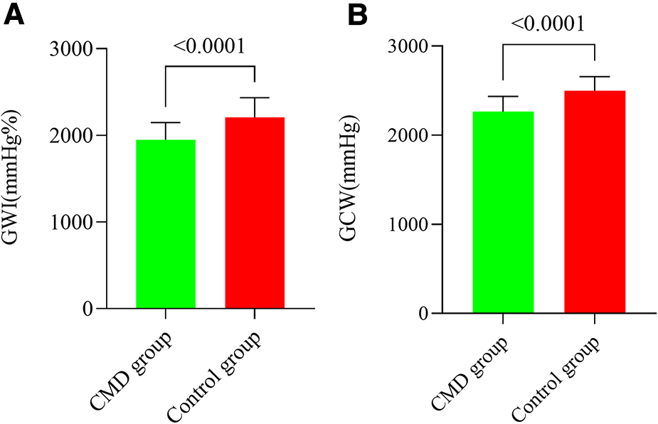 GWI and GCW among CMD patients and control counterparts. (A) GWI was strongly diminished among the CMD group. (B) GCW was strongly diminished among the CMD group. (A) GWI values provided as mmHg%. (B) GCW values provided as mmHg%.