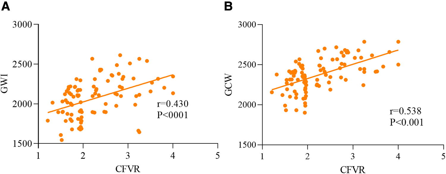 SPSS 25.0 (IBM, Armonk, NY, USA) was employed for all data analyses. Categorical statistics are provided as numbers and percentages. Results with a normal distribution were confirmed via the Shapiro-Wilk test. Based on the data distribution, normal data are provided as mean ± standard deviation, and non-normal data as the median (P25, P75). Analyses of data with a normal distribution were undertaken using the independent t-test. Analyses of data with a non-normal distribution were carried out using the Mann-Whitney test. Analyses of categorical data were based on the chi-square test. Spearman's correlation coefficient was used to test correlations of MWIs (including GWI and GCW) with CFVR.
